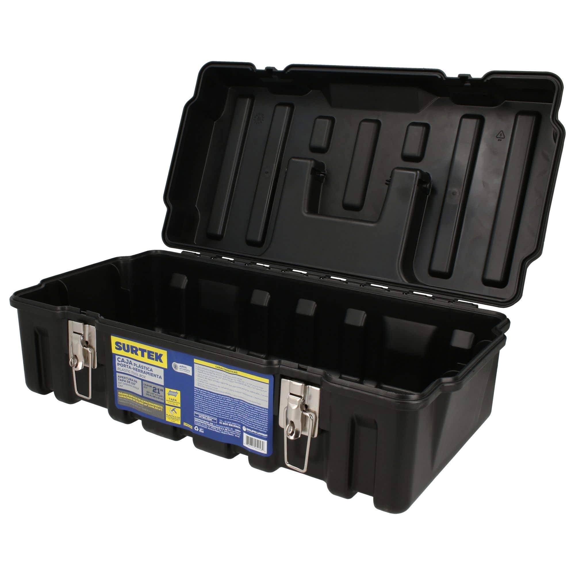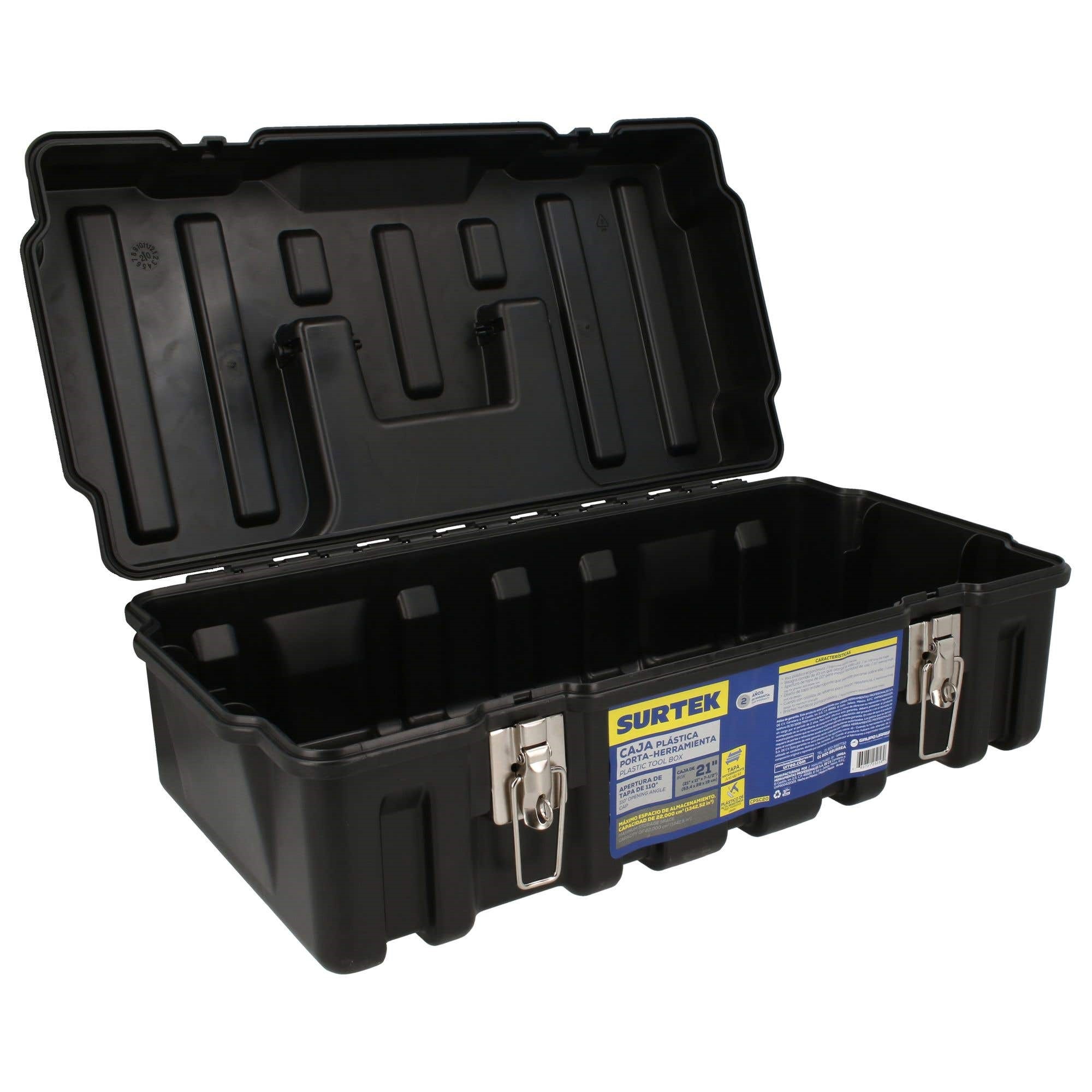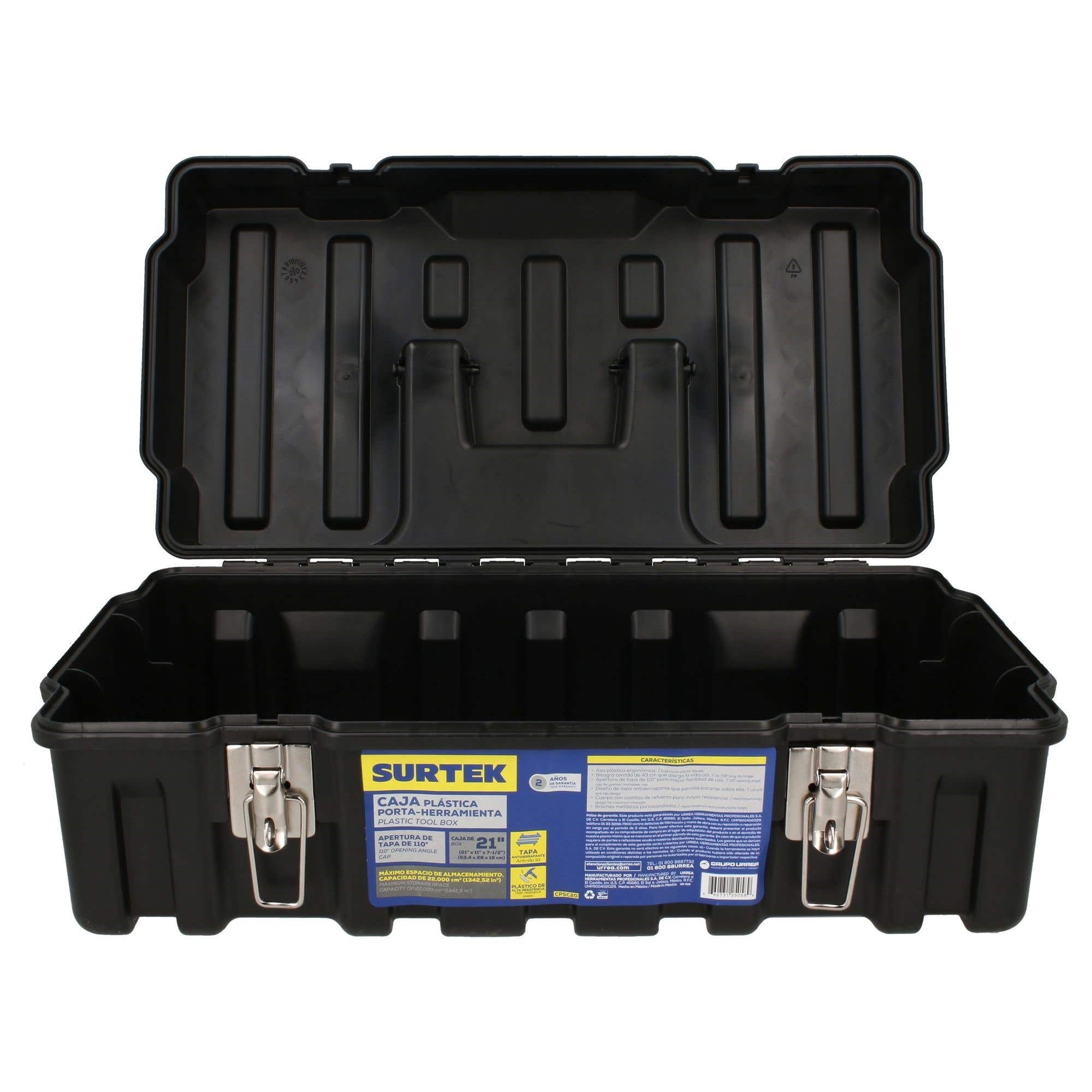 Plástico de alta resistencia Broches metálicos con porta candado Cuerpo con asas laterales Resistentes costillas de refuerzo Tapa de 110° de apertura Bisagra corrida Tapa antiderrapante que permite pararse sobre ella Adecuada para guardar herramientas con mango largo No incluye charola