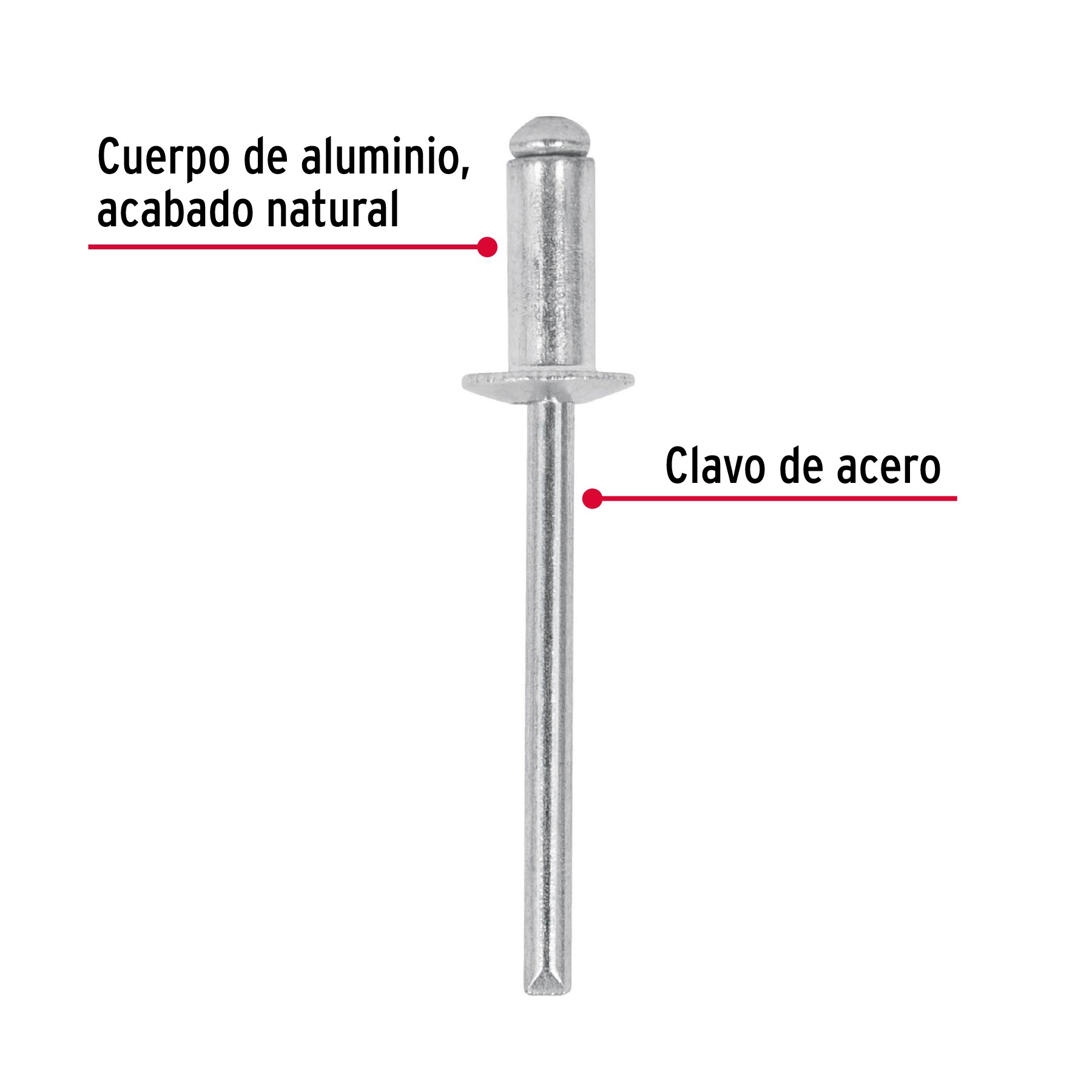 Cuerpo de aluminio con acabado natural. Clavo de acero. Para unir planchas metálicas, perfiles, hojalatería, electrodomésticos y estructuras en general. Compatible con remachadoras marca Truper.