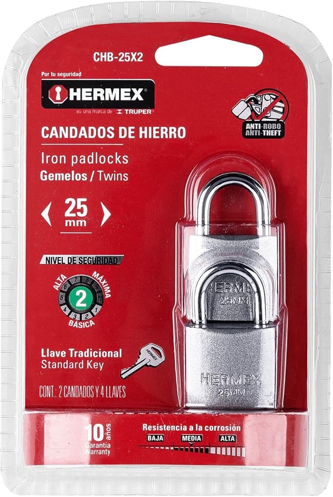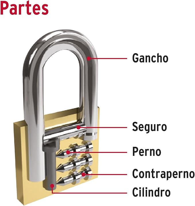 Cuerpo de hierro en una sola pieza, gancho corto de acero con acabado cromado. Seguro tipo perno, seguridad estándar. Cilindro de latón solido con 4 pines que brinda resistencia a robos. Llave y componentes de latón para mayor vida útil. Mecanismo interno resistente a la corrosión.