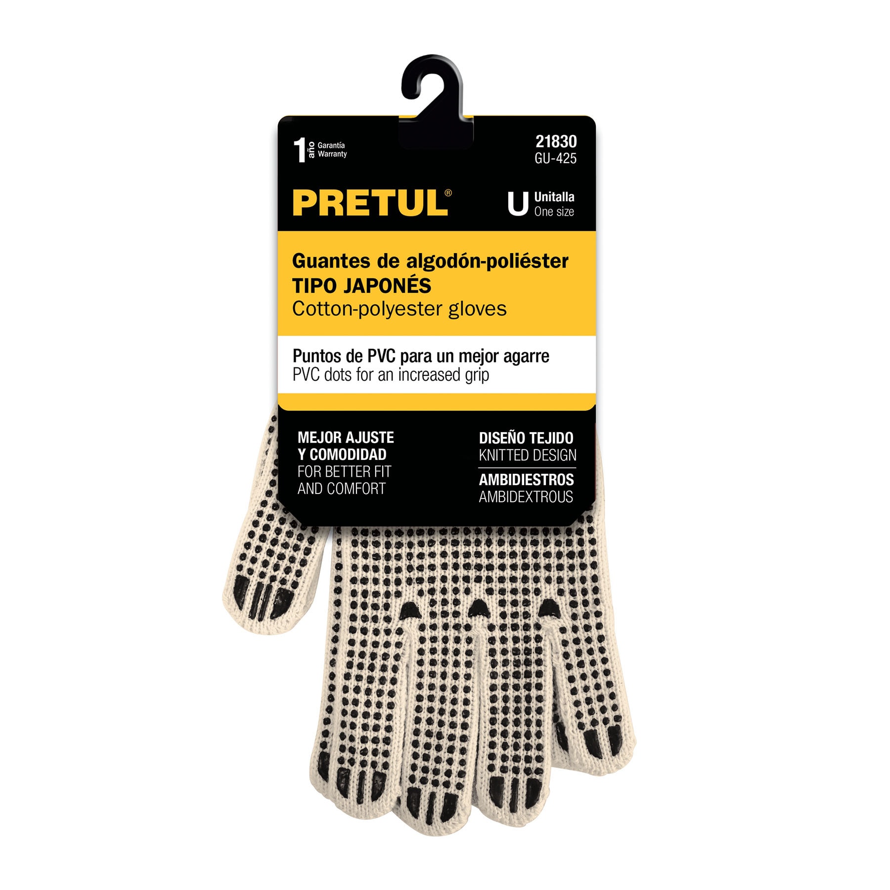 Algodón / Poliéster tejido de punto (tipo japonés). Puntos de PVC por ambos lados para excelente agarre y durabilidad. Excelente destreza. Ambidiestros y buena adherencia. Uso general, almacenamiento, automotriz, agricultura y jardinería.