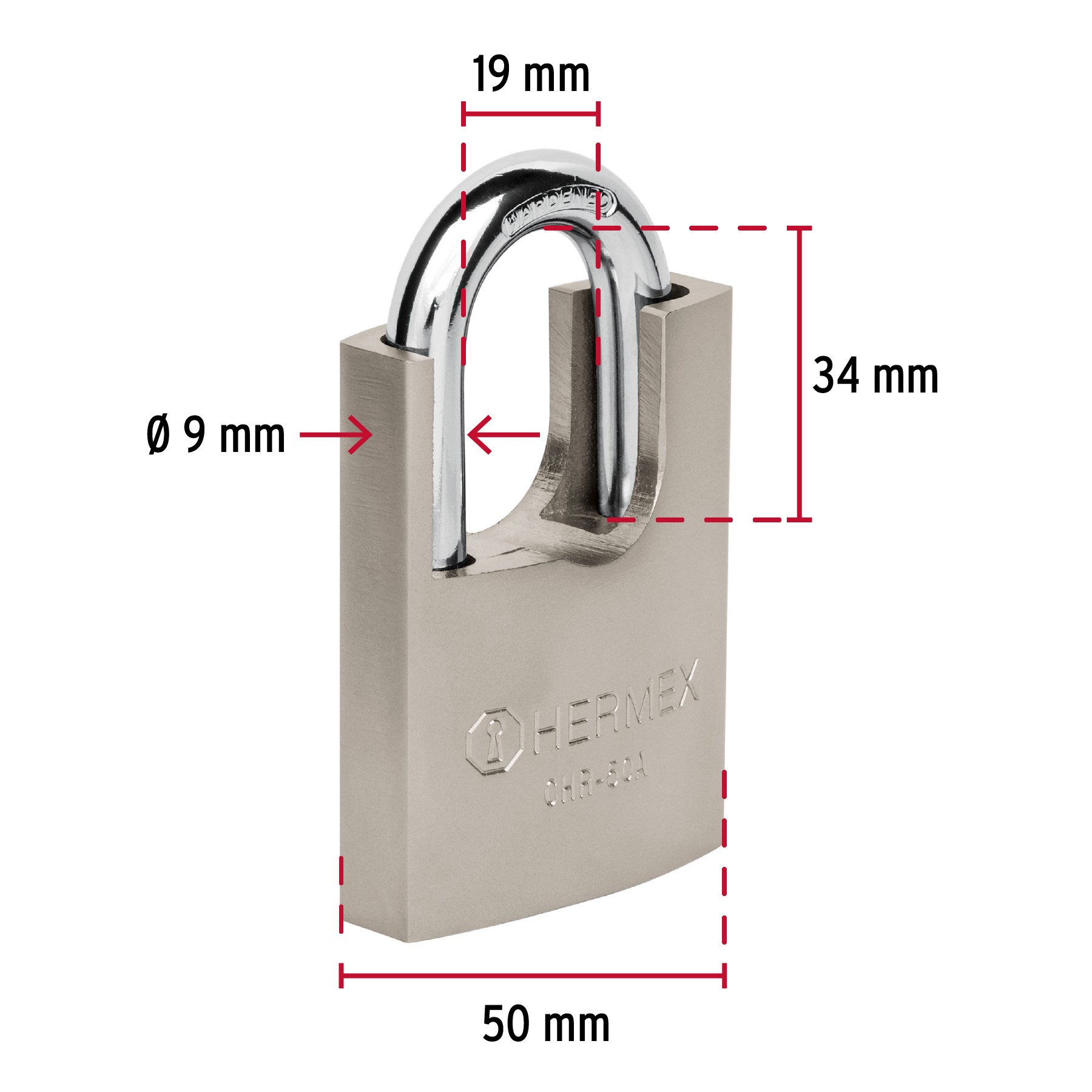 Cuerpo de hierro en una sola pieza con acabado pulido y gancho de acero acabado cromado. Cilindro de latón sólido con 7 pines que brinda resistencia a robos. Diseño especial de disco o plaqueta, con miles de combinaciones a prueba de ganzúa. Seguro preventivo que impide retirar la llave para evitar dejar el candado abierto. Mecanismo interno resistente a la corrosión.