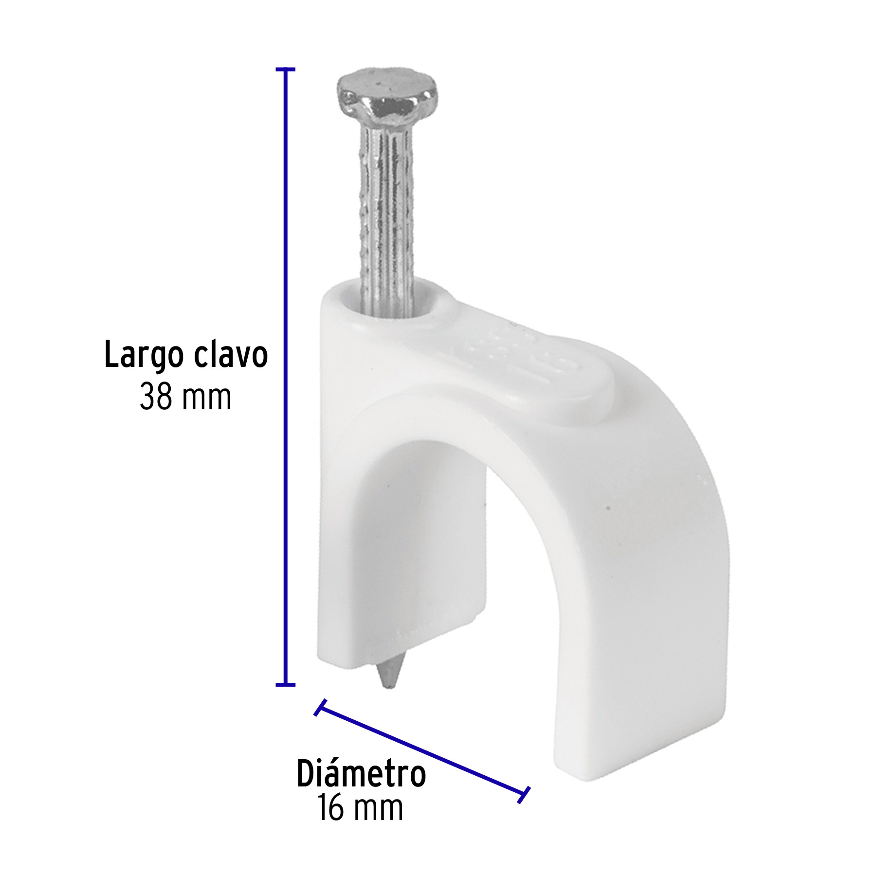 Fabricadas en polietileno. Incluye clavo. Para cables coaxiales o cables redondos.