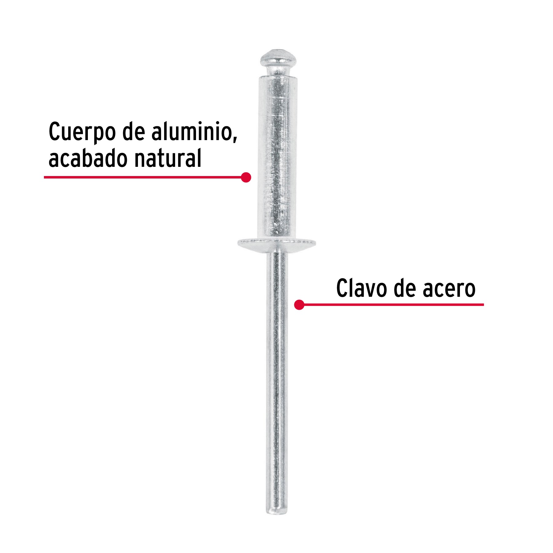 Cuerpo de aluminio con acabado natural. Clavo de acero. Para unir planchas metálicas, perfiles, hojalatería, electrodomésticos y estructuras en general. Compatible con remachadoras marca Truper.