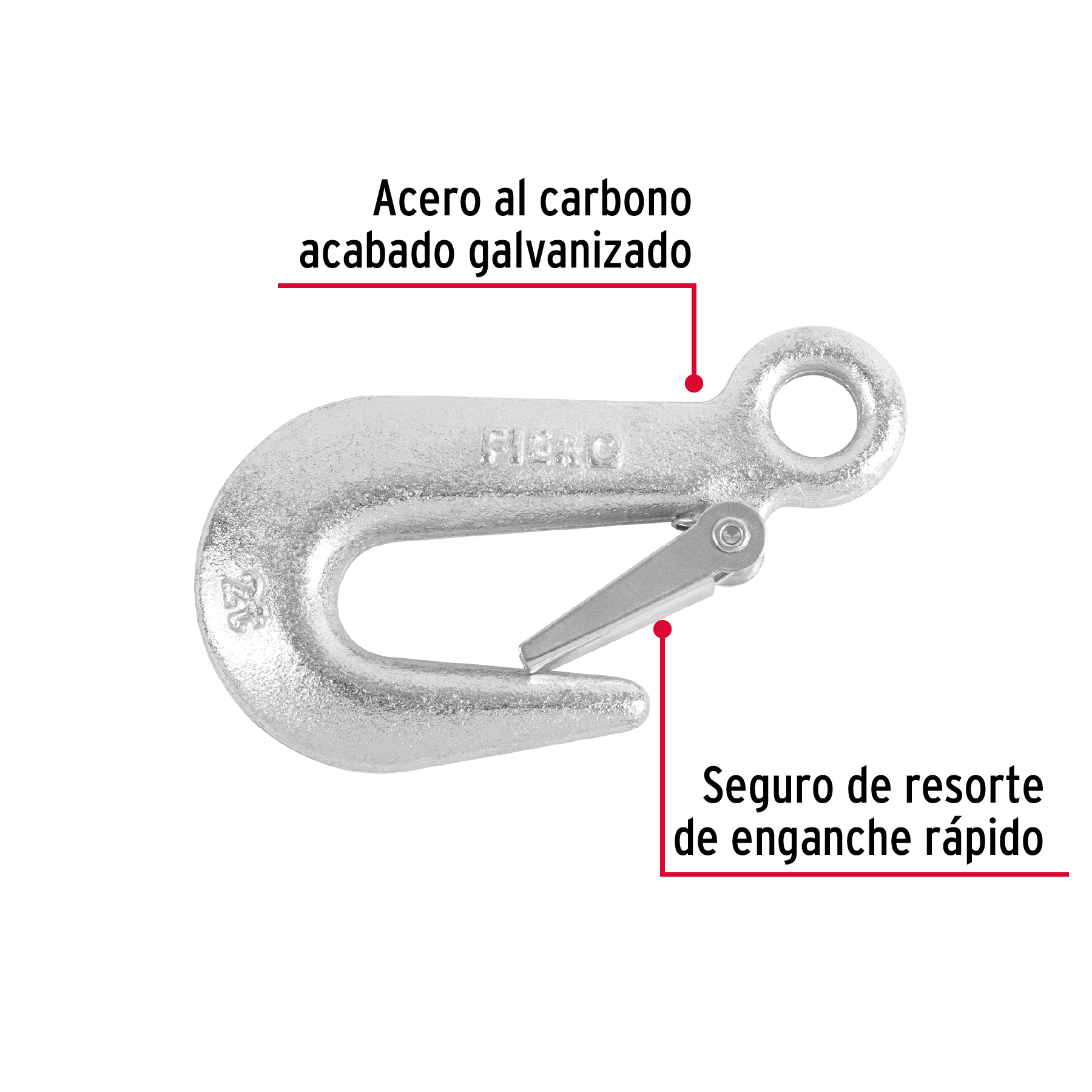 Forjado en acero al carbono, acabado galvanizado. Seguro de resorte de enganche rápido. No exceder límite marcado.