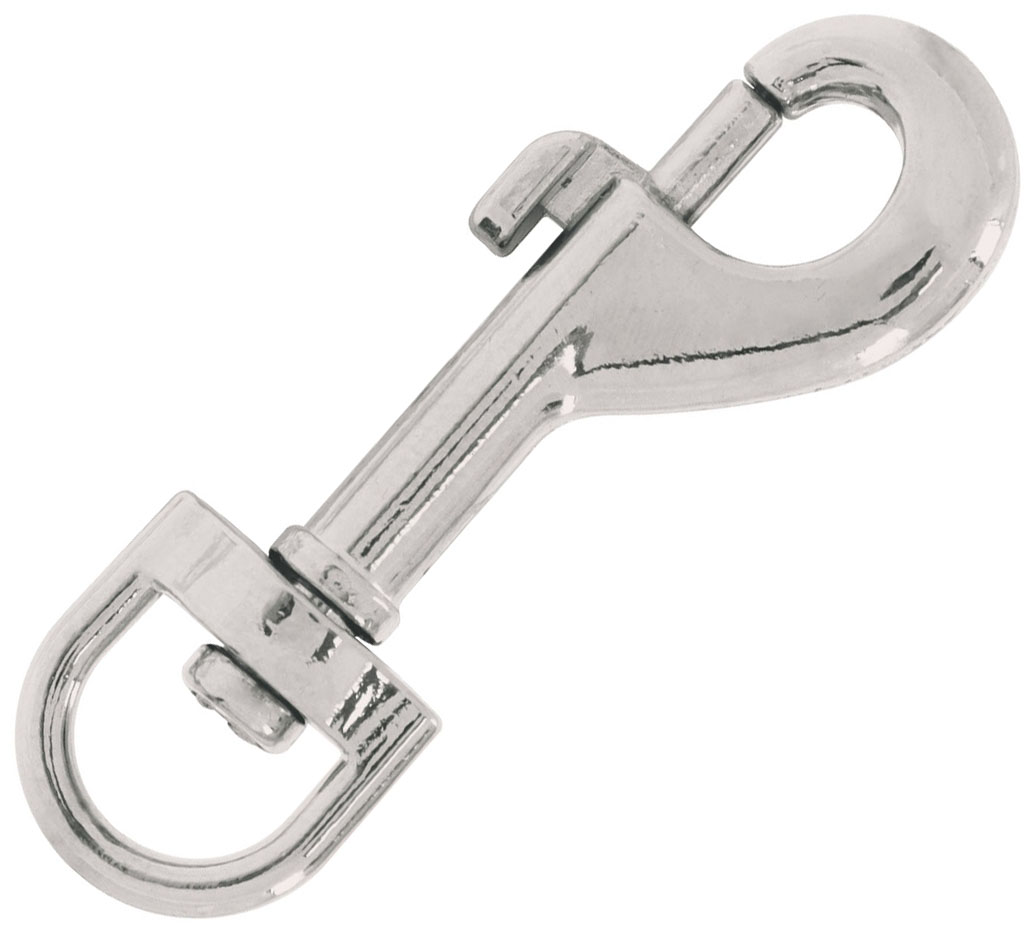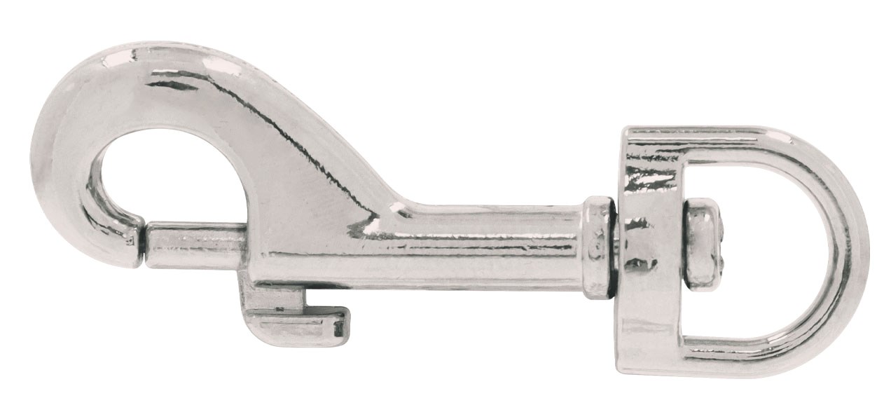 Cuerpo metálico, acabado niquelado para mayor resistencia a la corrosión. Ojo giratorio. Seguro de resorte para rápido enganche. Ideal para sujetar cordones, correas para perros.