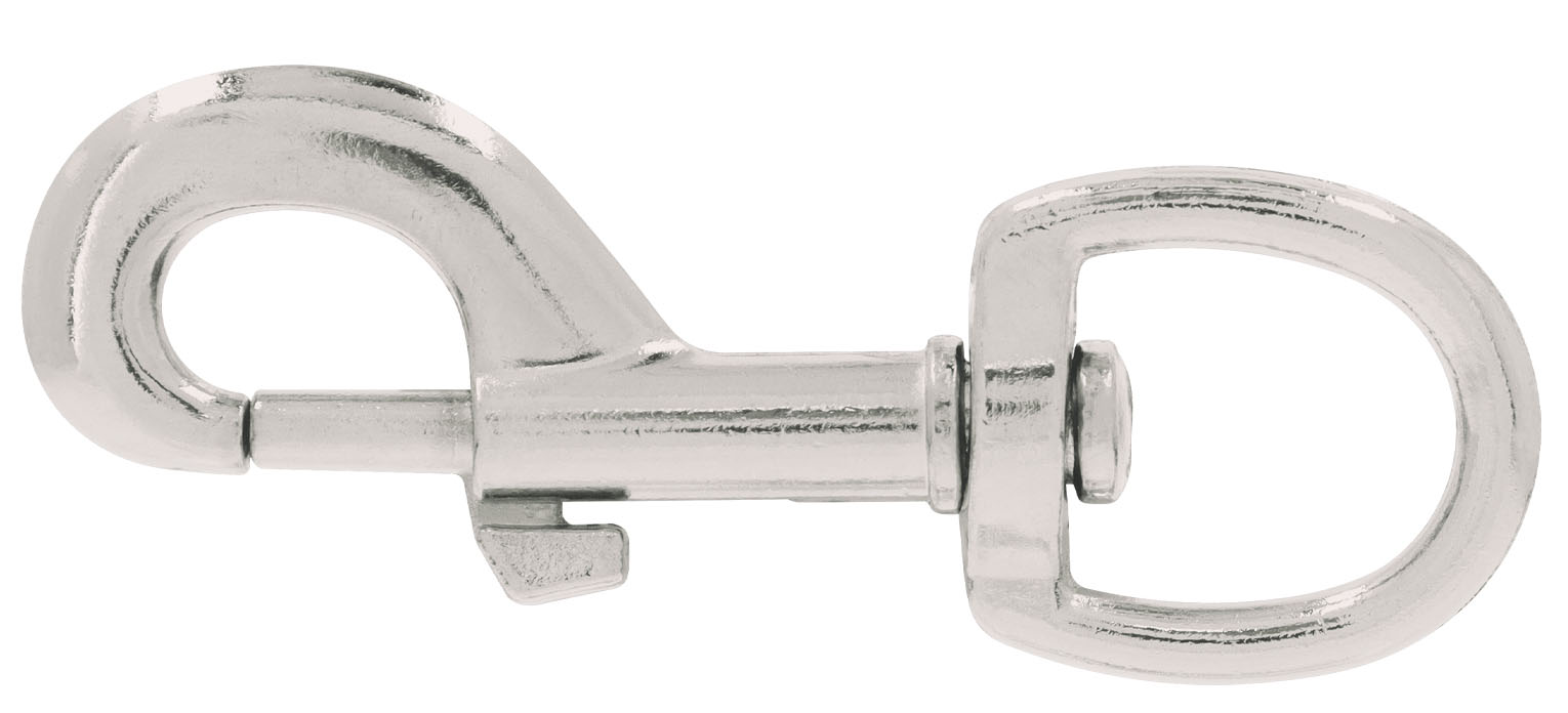 Cuerpo metálico, acabado niquelado para mayor resistencia a la corrosión. Ojo giratorio. Seguro de resorte para rápido enganche. Ideal para sujetar cordones, correas para perros.
