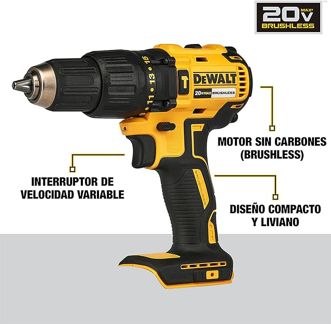 Taladro Inalámbrico DEWALT: potencia de 20V MAX y 340 UWO para desafíos exigentes. Taladro DEWALT tiene diseño compacto y ergonómico con mango de goma para un agarre cómodo. Función atornilladora, luz LED y control de velocidad reversible para mayor precisión con DEWALT 20v. Atornillador DEWALT tiene mandril de 1/2"" y dos velocidades para adaptarse a cada tarea. Incluye cargador, 2 baterías de 2Ah y caja para herramientas para mayor comodidad y practicidad en cualquier trabajo.