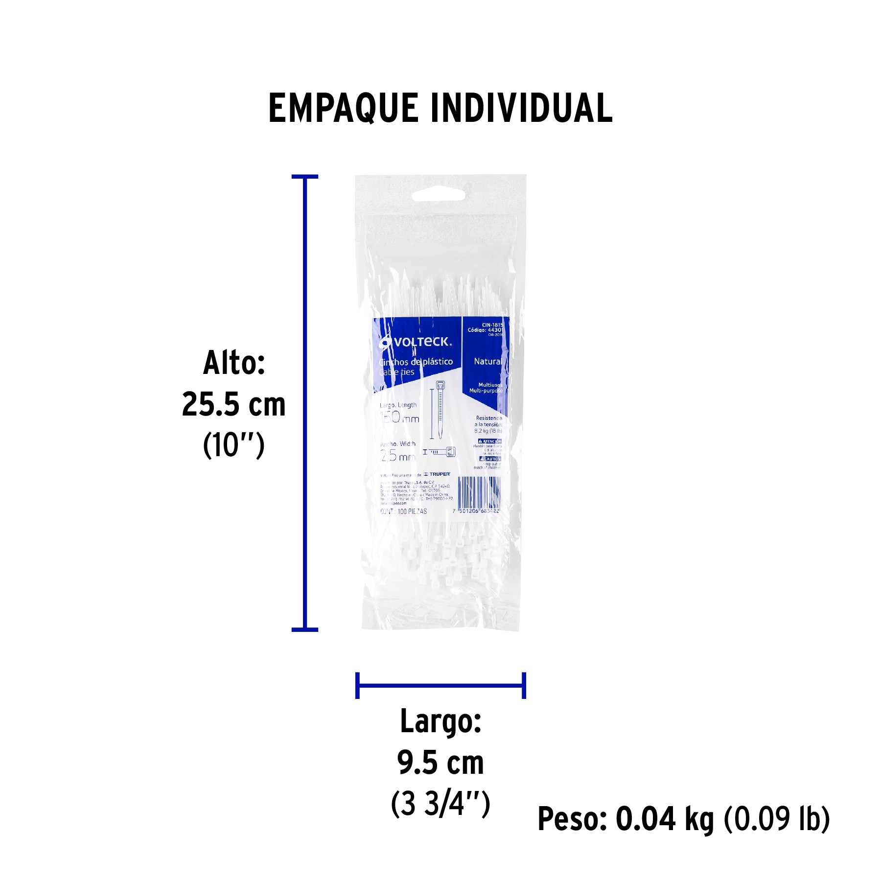 BOLSA CON 100 CINCHOS PLASTICOS DE 18 LBS DE 150 MM X 2.5 MM COLOR NATURAL VOLTECK