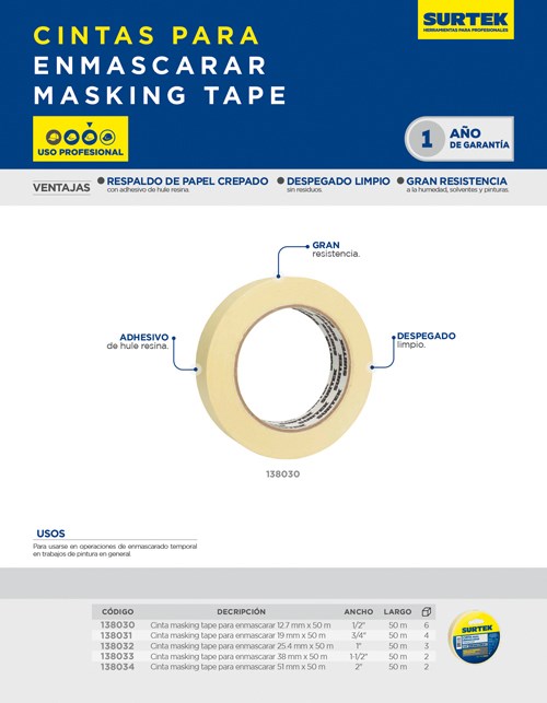 CINTA MASKING TAPE PARA ENMASCARAR 36 MM X 50 MTS SURTEK