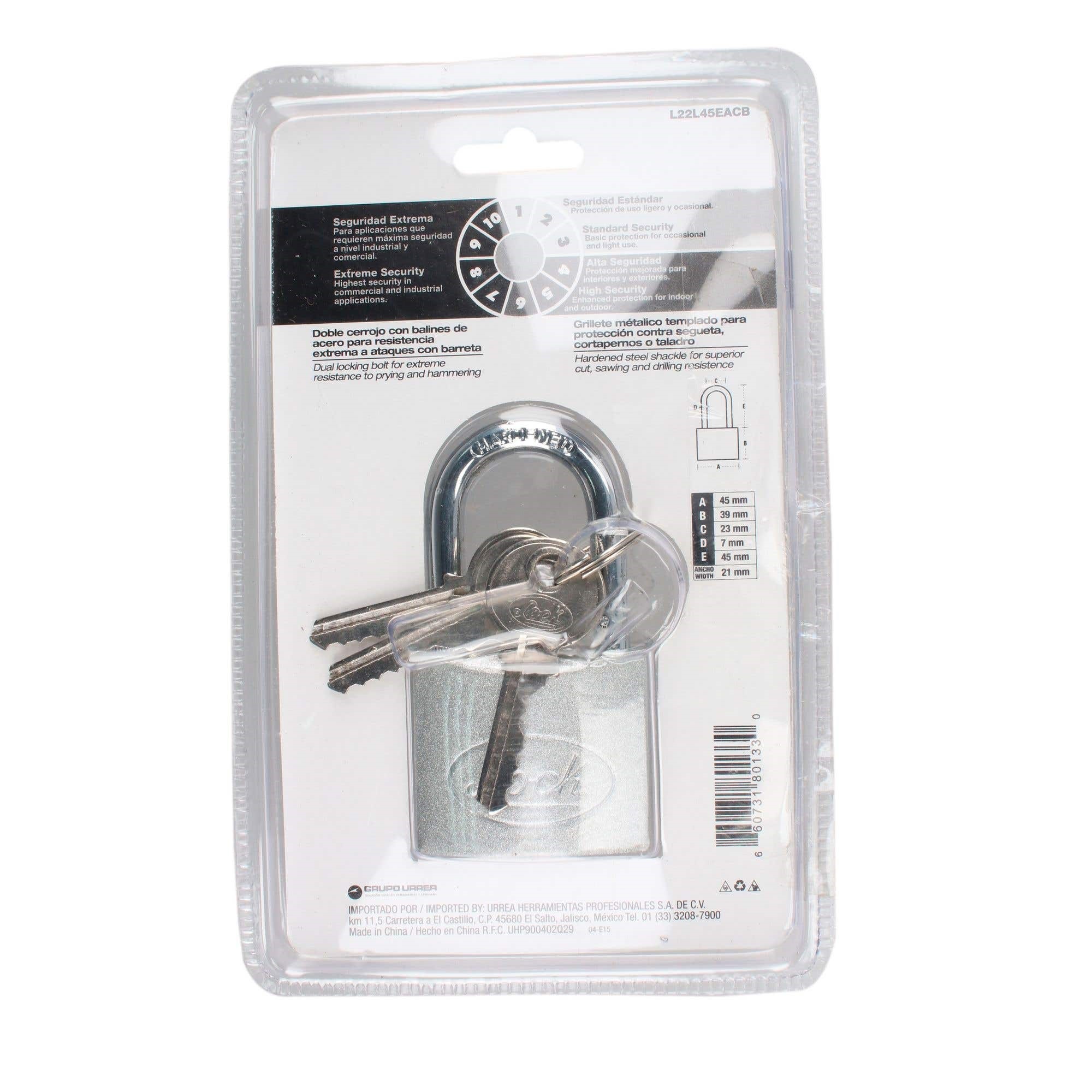 CANDADO DE ACERO LARGO LLAVE ESTANDAR 45MM LOCK