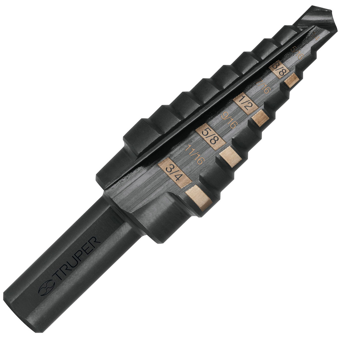 Punta Split Point autocentrable con dos filos de corte, para perforaciones más rápidas y precisas. Rango de perforación 1/4" - 3/4". Diámetro marcado en láser de larga duración para identificar rápidamente el tamaño a perforar. Fabricada en acero M2 de alta velocidad (HSS) con acabado óxido negro. Una sola broca realiza perforaciones de diferentes diámetros.