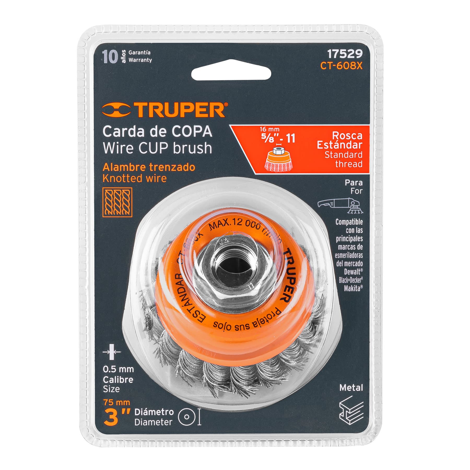 CARDA DE COPA DE 3" CON ALAMBRE TRENZADO GRUESO CON EJE DE 5/8" DE DIAMETRO Y 11 HILOS POR PULGADA TRUPER