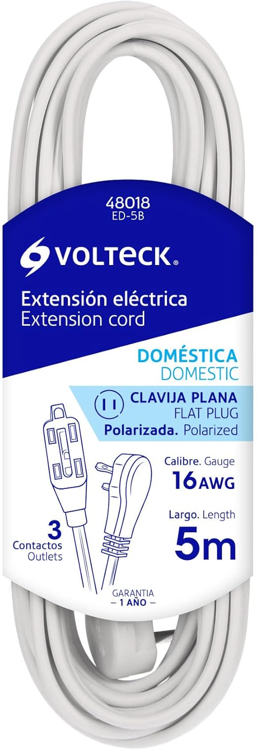 EXTENSION ELECTRICA DOMESTICA DE 5 MTS CON CLAVIJA PLANA BLANCA VOLTECK