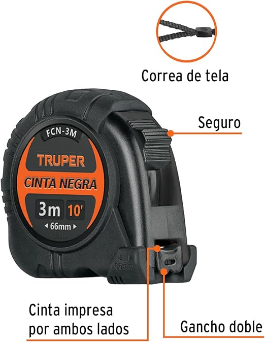 FLEXOMETRO CONTRA IMPACTOS DE 3 MTS CON CINTA NEGRA DE 13 MILIMETROS TRUPER