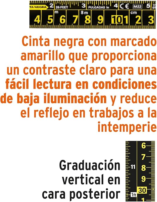 Carcasa de ABS y cubierta de TPR resistente a impactos. Cinta impresa por ambos lados recubierta de laca para máxima duración de la graduación. Gancho doble con triple imán, facilita la medición por ambos lados. Clip de palanca para mejor sujeción.