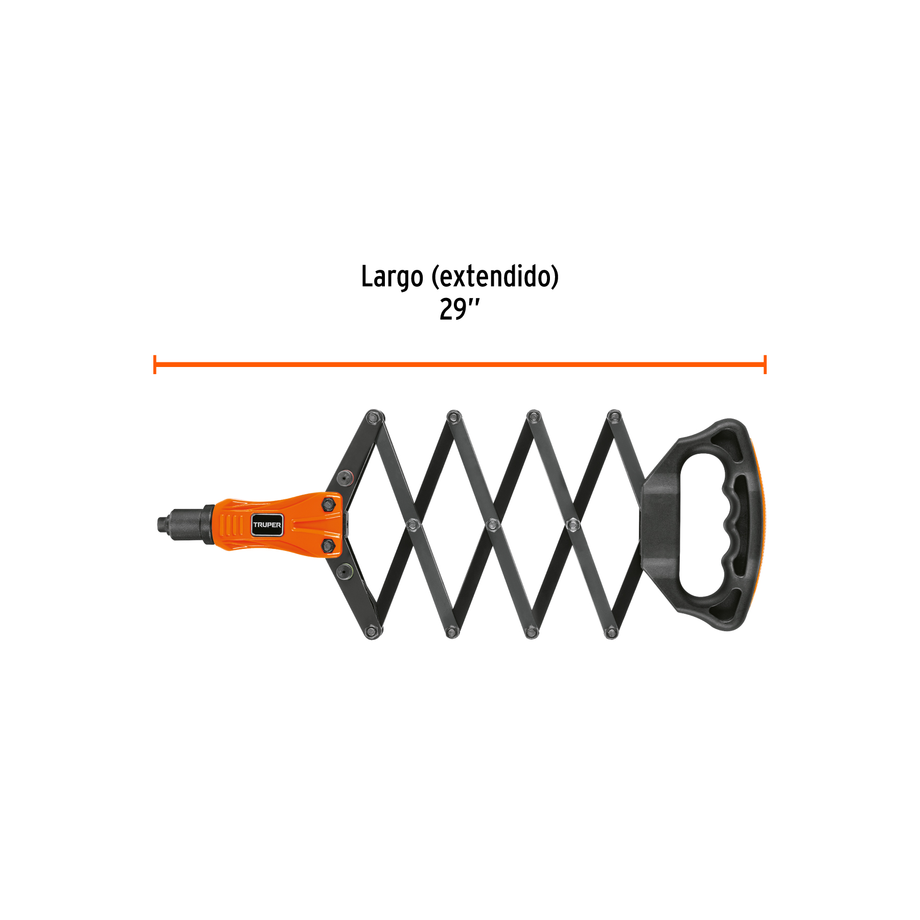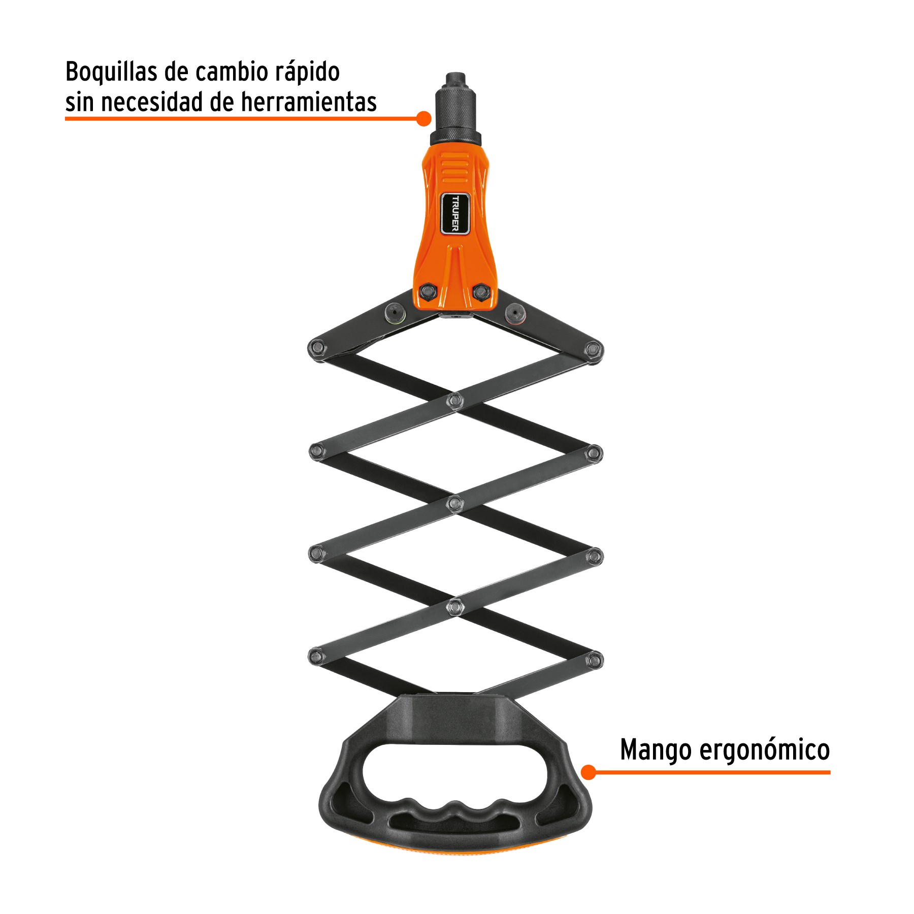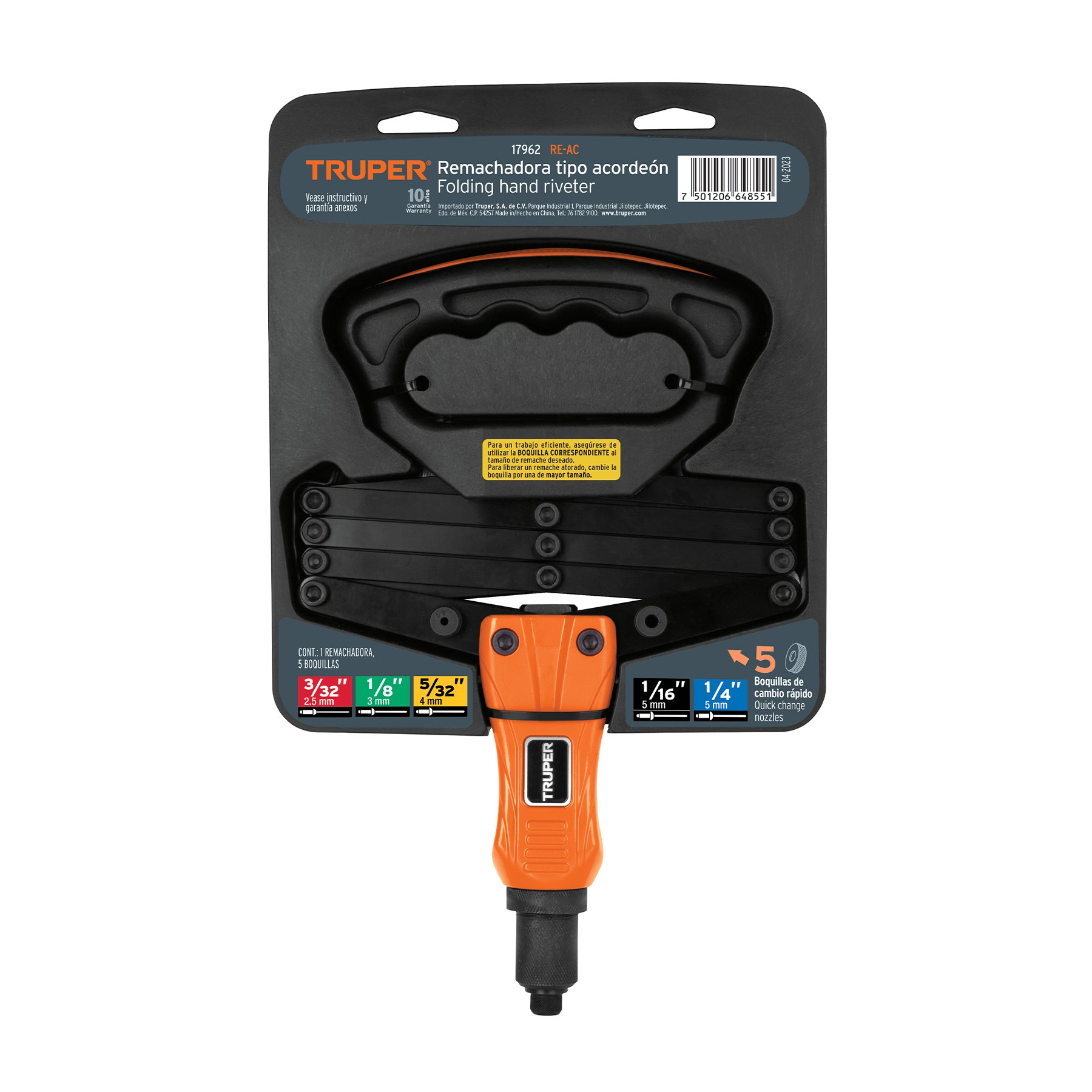 DescripciónCuerpo de aluminio y mango ergonómico. 5 boquillas intercambiables con indicador de color para fácil identificación de remaches: 3/32", 1/8", 5/32", 3/16" y 1/4". Fácil inserción de remaches en lugares de difícil acceso.Comentarios0 Cuerpo de aluminio y mango ergonómico. 5 boquillas intercambiables con indicador de color para fácil identificación de remaches: 3/32", 1/8", 5/32", 3/16" y 1/4". Fácil inserción de remaches en lugares de difícil acceso. Escribe una reseña No hay comentarios aún