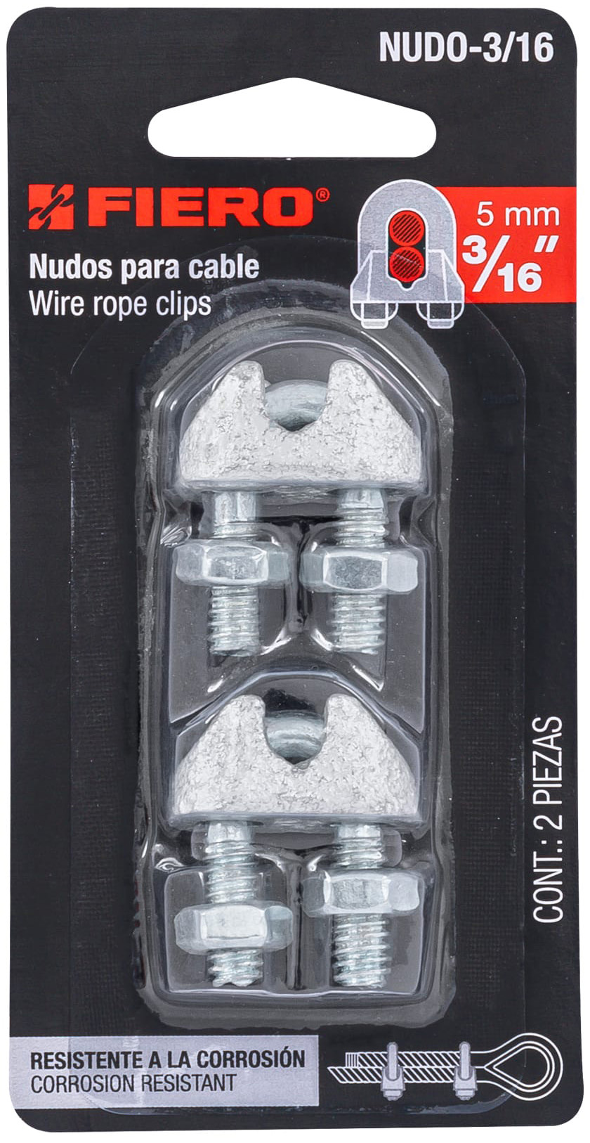 Imagen de BLISTER CON 2 NUDOS (PERROS) DE HIERRO PARA CABLE DE 3/16" FIERO