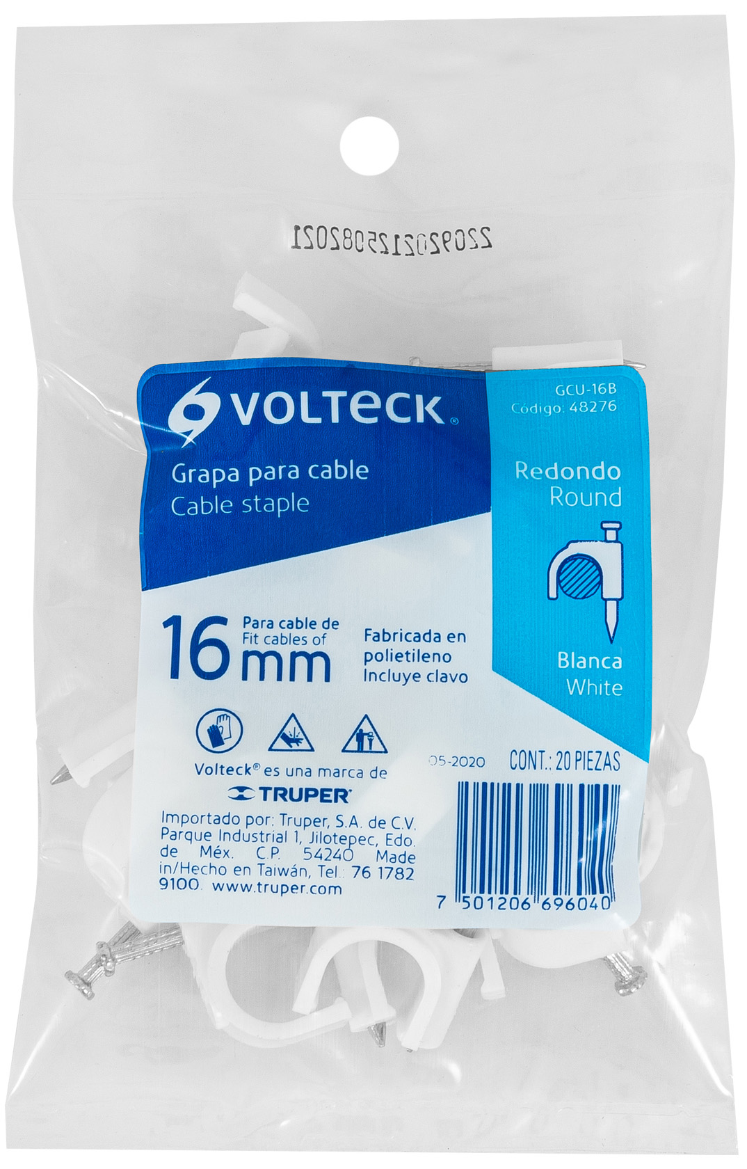 BOLSA CON 20 GRAPAS BLANCAS DE 16 MM PARA CABLE REDONDO VOLTECK