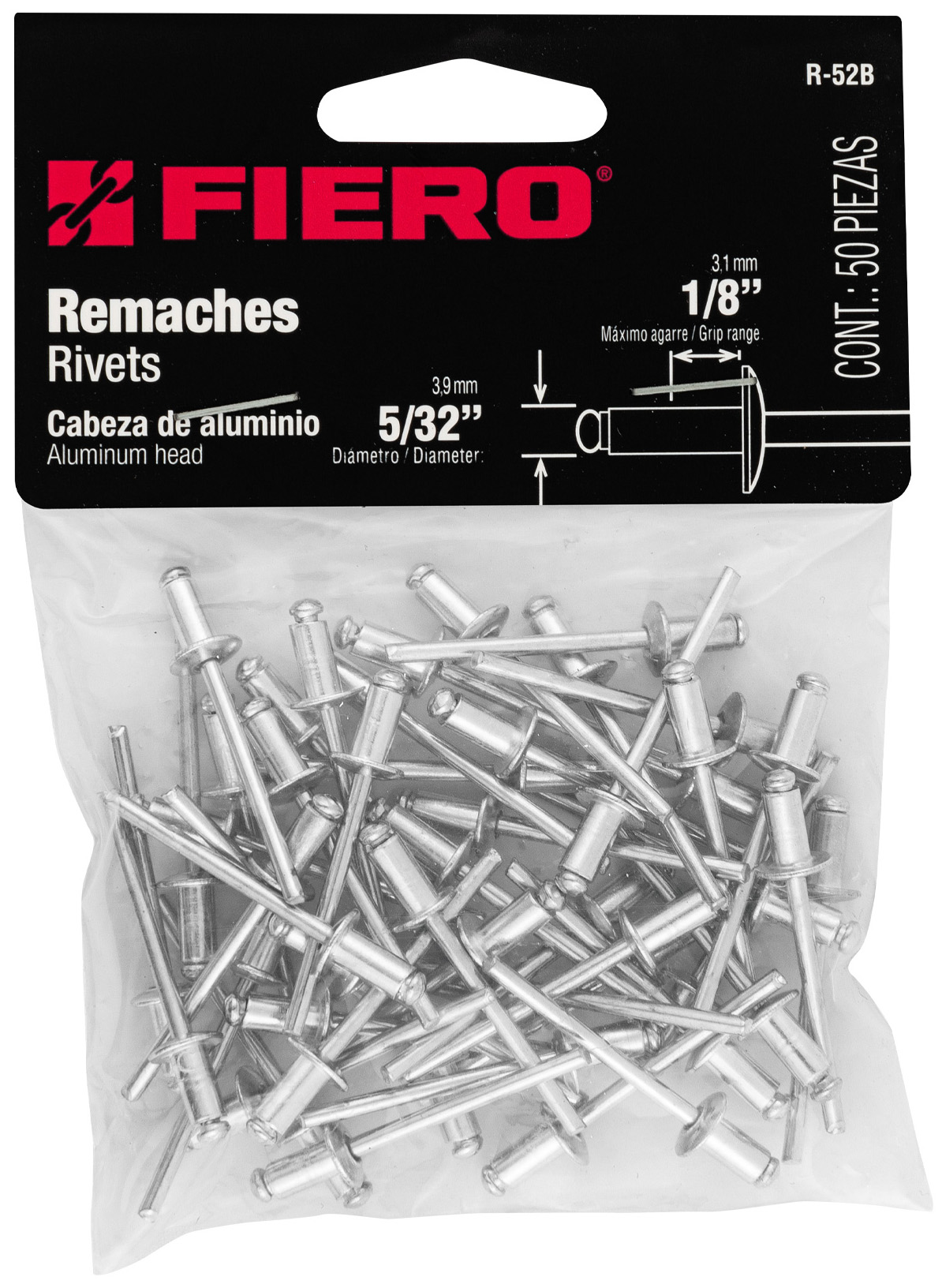 BOLSA CON 50 REMACHES DE 5/32" X 1/8" DE ALUMINIO CON MEDIDA DE ALA DE 5/16" FIERO