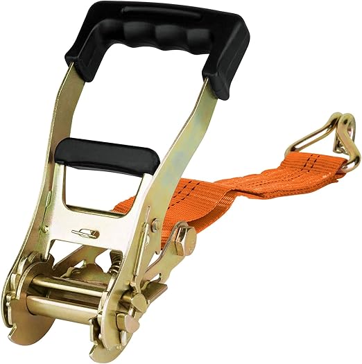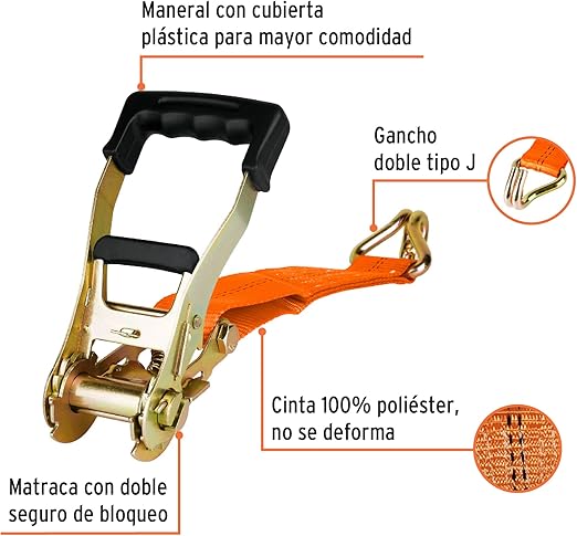 Cinta 100% poliéster, no se deforma. Gancho doble tipo J con recubrimiento tropicalizado resistente a la corrosión. Maneral con cubierta plástica para mayor comodidad. Doble seguro de bloqueo que mantiene la matraca en posición cerrada. Carga media, ideal para autos y motos.