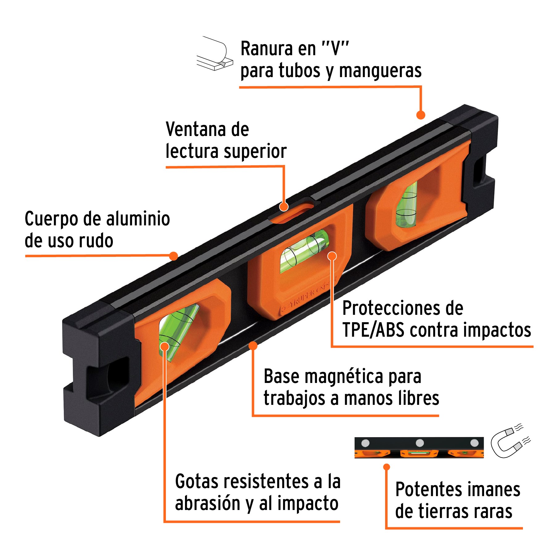 Cuerpo de aluminio de uso rudo con protecciones de TPE/ABS contra impactos. Gotas resistentes a la abrasión y al impacto. Fácil lectura desde ángulos 0°, 45° y 90°. Ventana de lectura superior. Ranura en "V" que facilita su uso con tubos y mangueras.