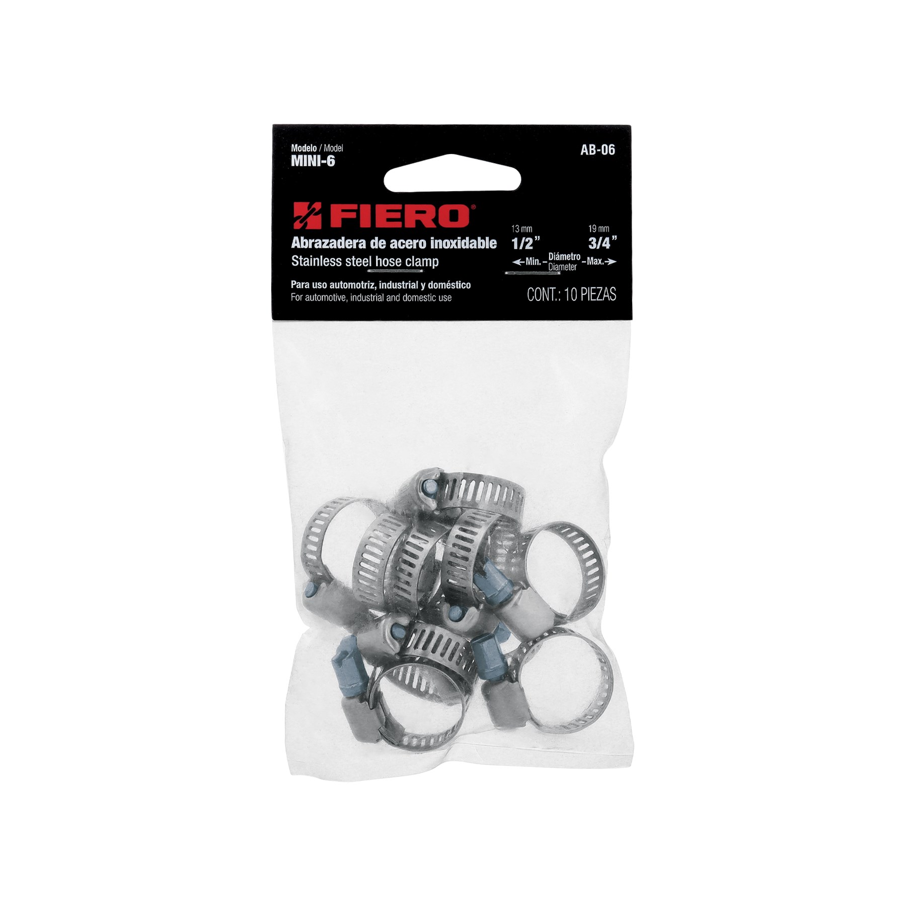 BOLSA CON 10 ABRAZADERAS MINI SIN FIN REFORZADAS #6 DE 1/2"-3/4" FIERO