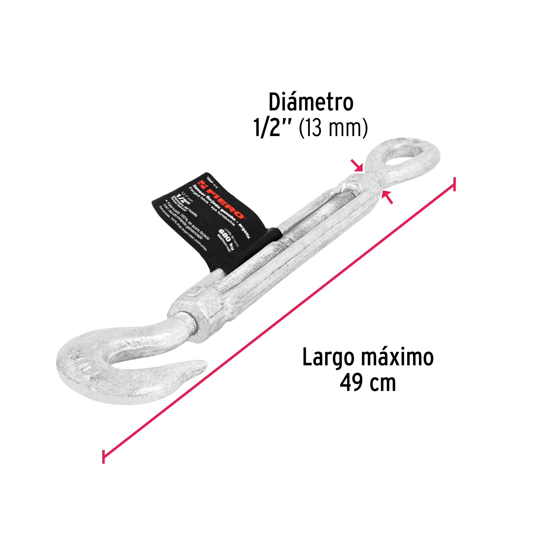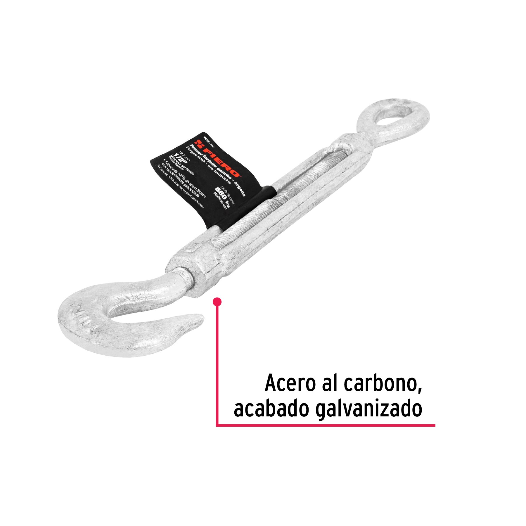 Fabricado en acero al carbono con acabado galvanizado resistente a la corrosión. Para tensar o emparejar cables. No exceder límite marcado.