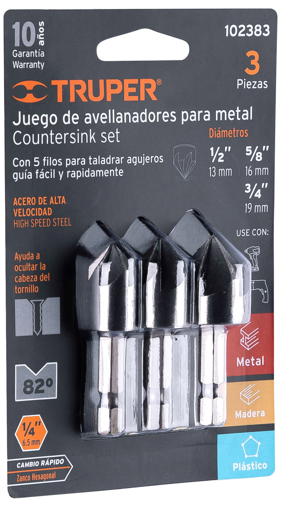 DescripciónÁngulo de punta 82°. Zanco hexagonal de cambio rápido. Ayuda a ocultar la cabeza del tornillo. Para metales ferrosos, no ferrosos, madera y plástico.Comentarios0 Ángulo de punta 82°. Zanco hexagonal de cambio rápido. Ayuda a ocultar la cabeza del tornillo. Para metales ferrosos, no ferrosos, madera y plástico. Escribe una reseña No hay comentarios aún