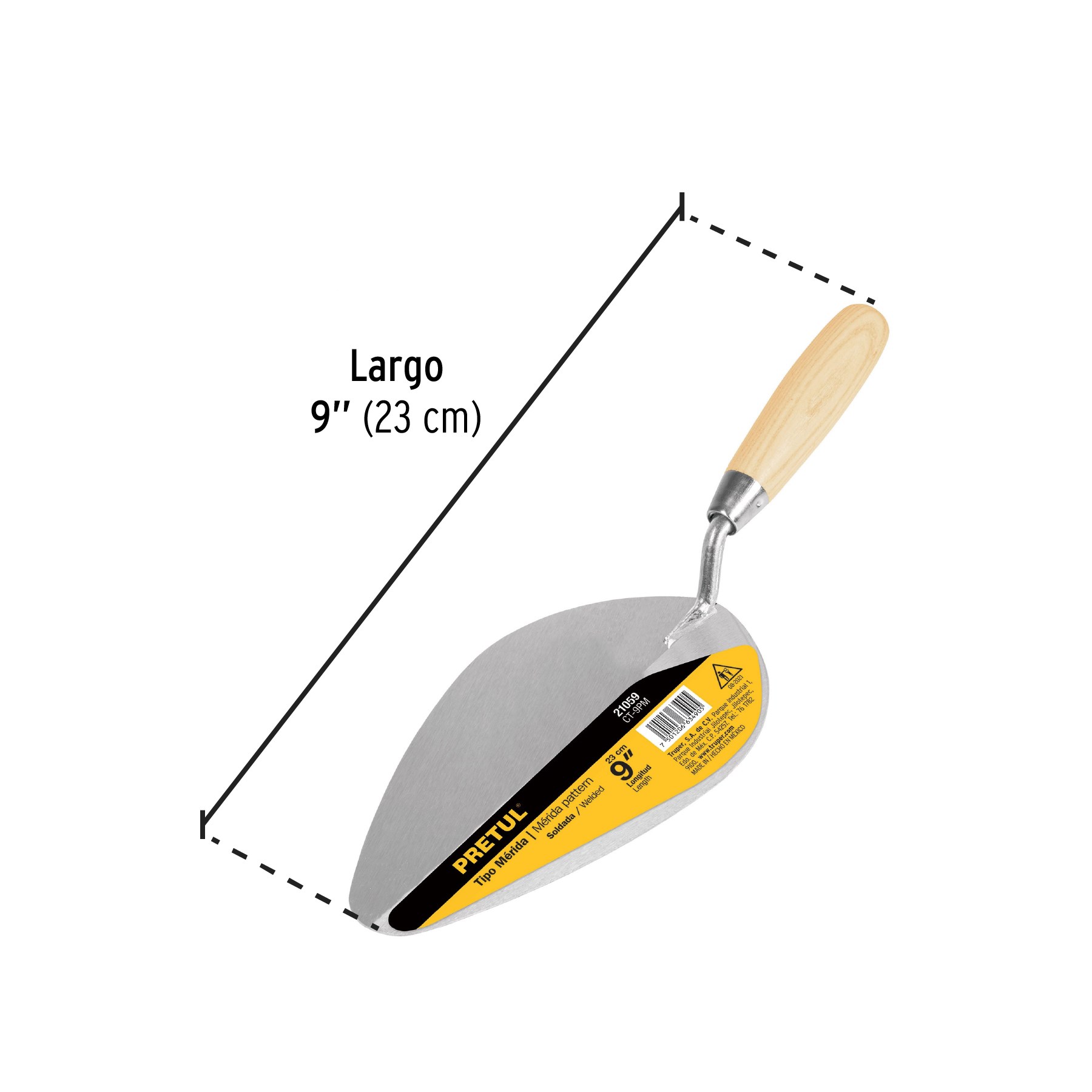 Hoja de acero templado que proporciona mayor resistencia al desgaste. Mango de madera pulido y laqueado. Ensamble reforzado de mango y zanco con casquillo crimpado y adhesivo de uretano que evita que gire el mango. Ideal para aplicar yeso y aplanar muros.