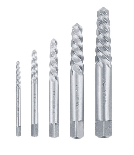 DescripciónFabricados en acero al cromo. Estriado tipo espiral para un agarre firme. Para sacar pernos o tornillos de 1/8" a 3/4", barridos o rotos.Comentarios0 Fabricados en acero al cromo. Estriado tipo espiral para un agarre firme. Para sacar pernos o tornillos de 1/8" a 3/4", barridos o rotos. Escribe una reseña No hay comentarios aún