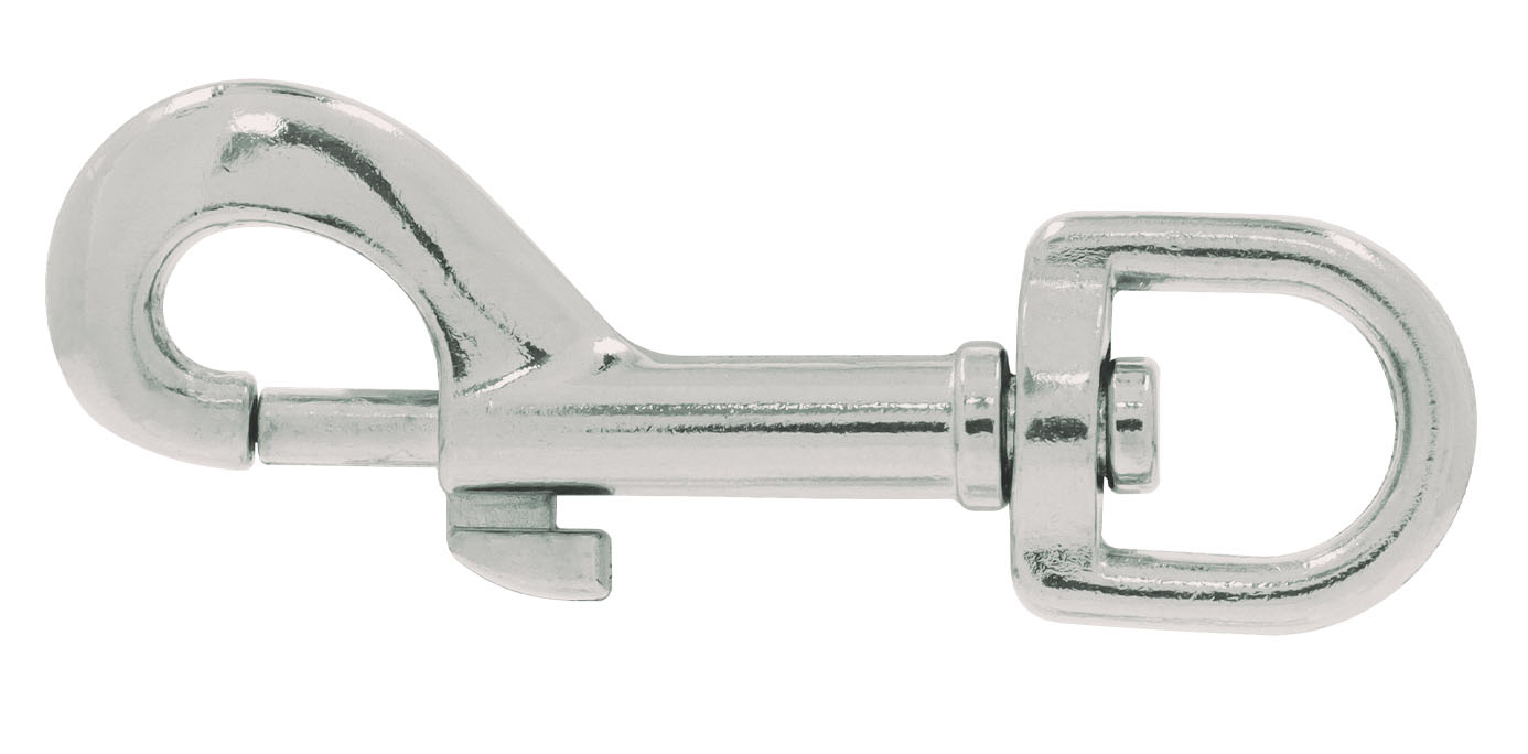 Cuerpo metálico, acabado niquelado para mayor resistencia a la corrosión. Ojo giratorio. Seguro de resorte para rápido enganche. Ideal para sujetar cordones, correas para perros.