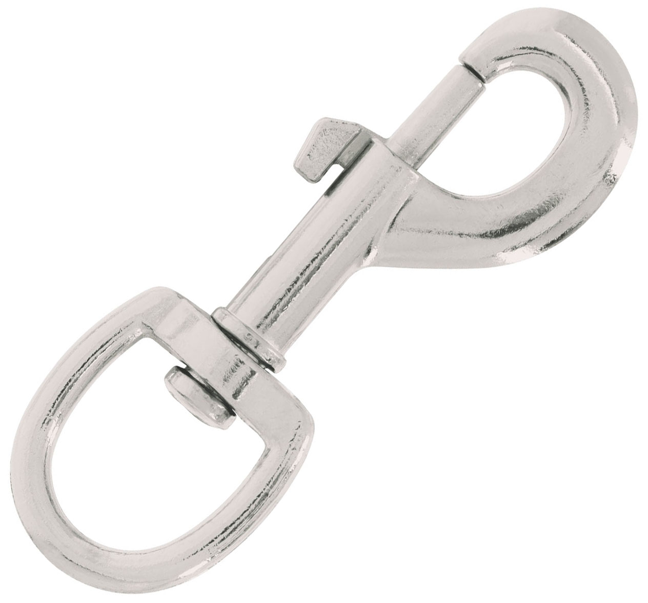 Cuerpo metálico, acabado niquelado para mayor resistencia a la corrosión. Ojo giratorio. Seguro de resorte para rápido enganche. Ideal para sujetar cordones, correas para perros.