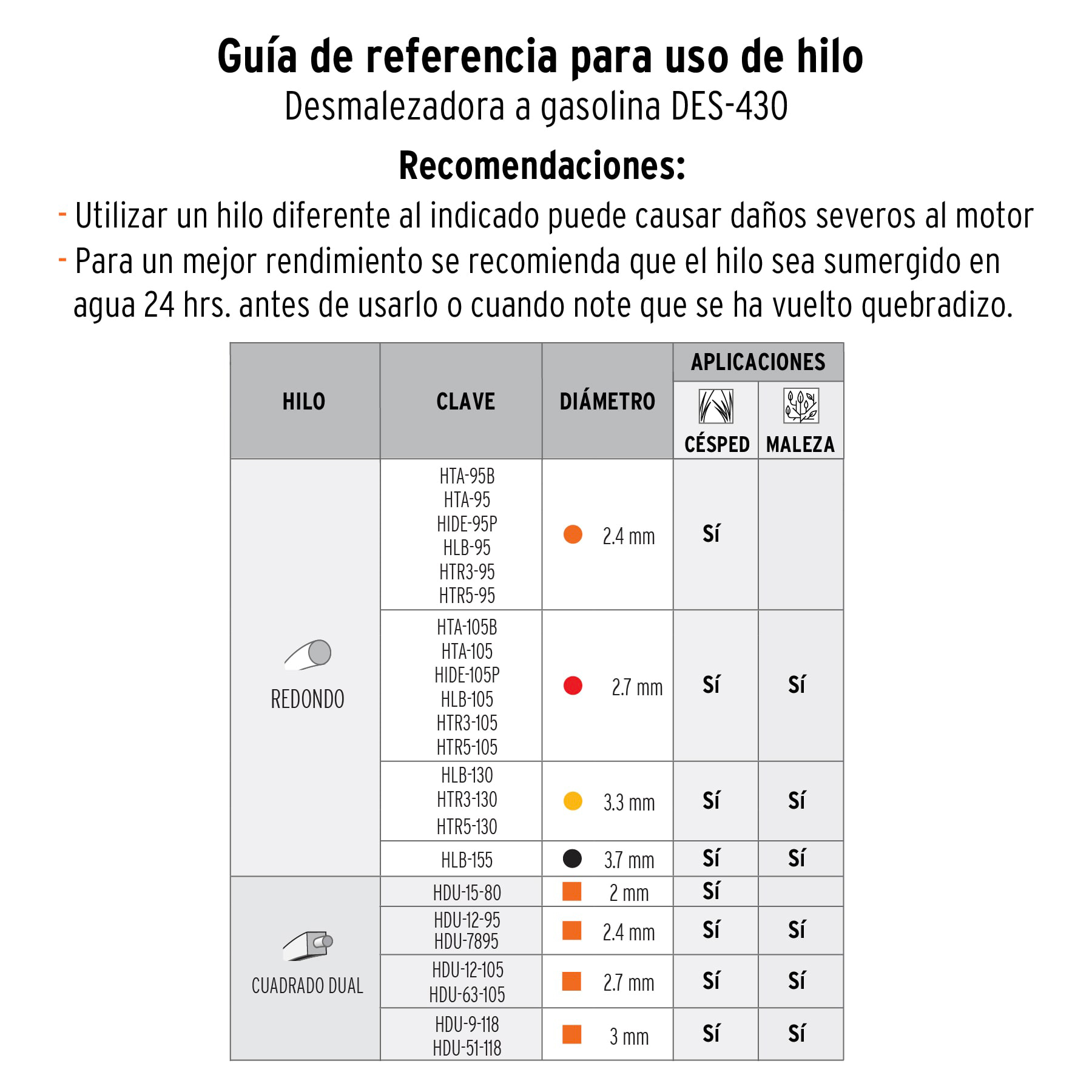 Motor de 1.7 HP a 2 tiempos (materiales internos en aluminio al alto silicio para mayor tiempo de vida útil). Sistema de arranque con embrague. Eje recto de aluminio, permite cortar áreas más grandes en menor tiempo, ofrece mayor torque y menor vibración. Mango abatible que facilita su transporte y almacenamiento. Arnés completo que distribuye el peso sobre los hombros y la espalda, reduciendo la fatiga.