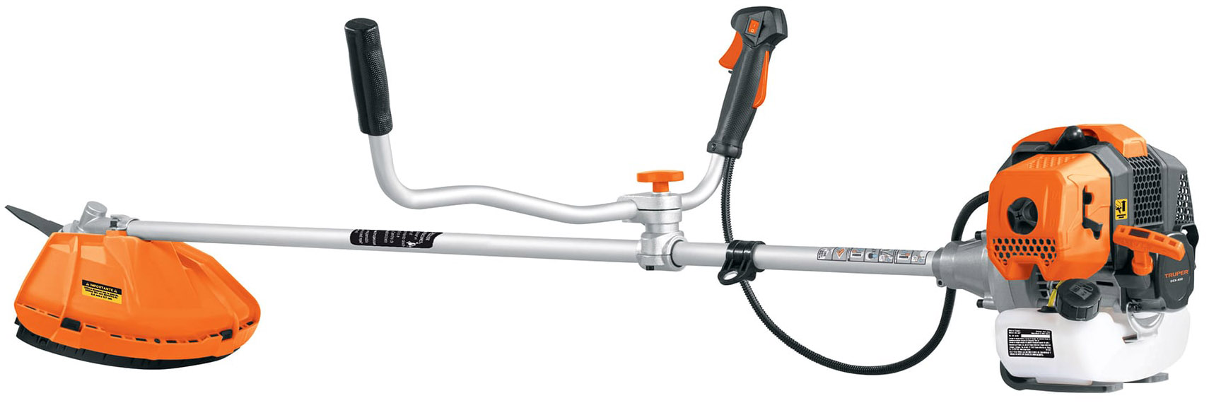 Motor de 1.7 HP a 2 tiempos (materiales internos en aluminio al alto silicio para mayor tiempo de vida útil). Sistema de arranque con embrague. Eje recto de aluminio, permite cortar áreas más grandes en menor tiempo, ofrece mayor torque y menor vibración. Mango abatible que facilita su transporte y almacenamiento. Arnés completo que distribuye el peso sobre los hombros y la espalda, reduciendo la fatiga.