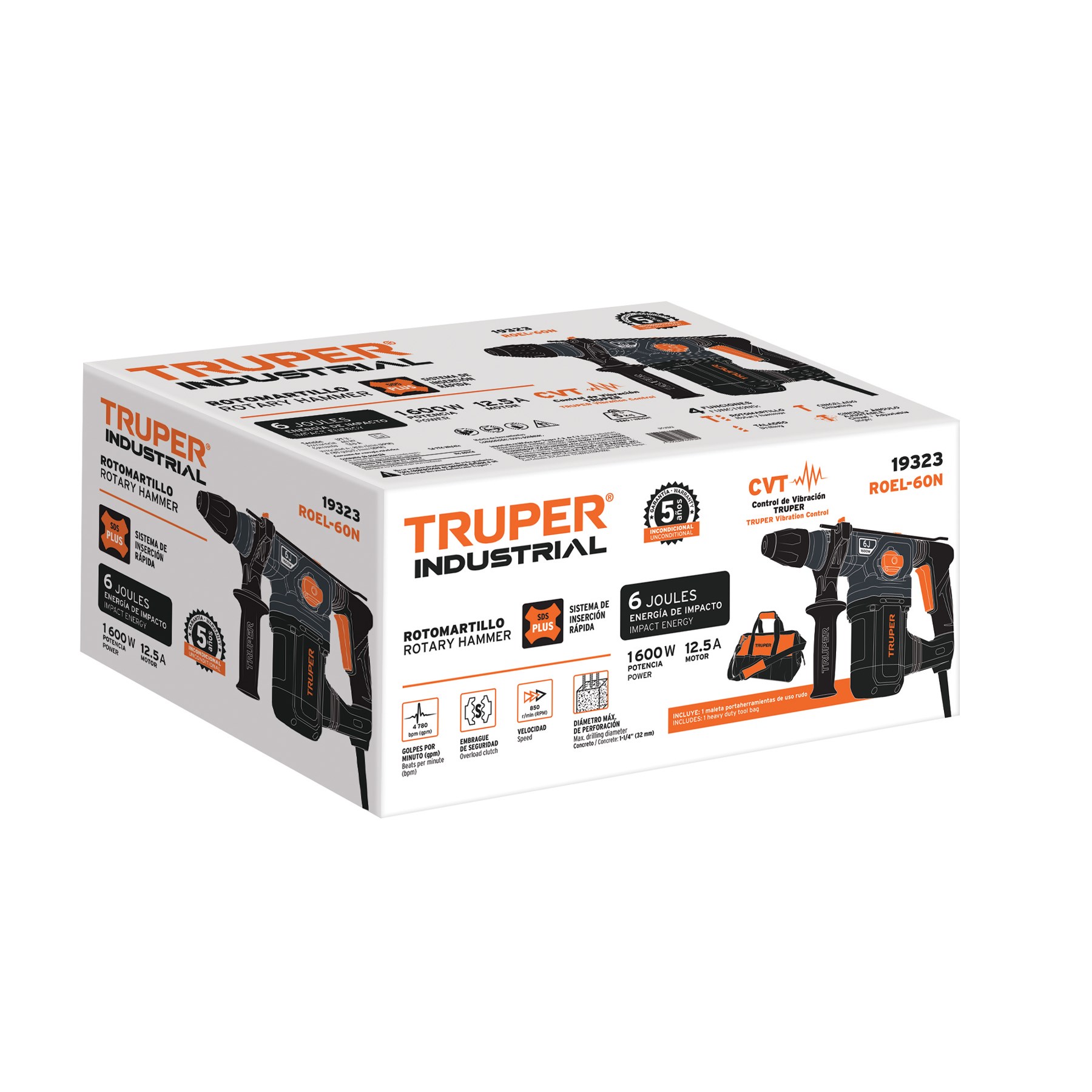 Motor de 1600 W con potencia suficiente para trabajos de alto rendimiento. 6 Joules de energía de impacto que ofrecen gran capacidad de remoción de material. Portaherramienta SDS Plus. Mango con sistema de Control de Vibración Truper (CVT) que reduce las vibraciones, haciendo el trabajo más confortable y seguro para el operador. Empuñadura con grip antiderrapante y mango auxiliar que gira 360° para mayor control del operador.