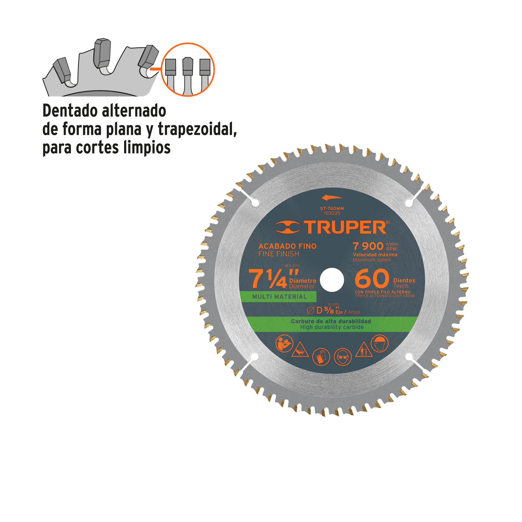 Descripción60 dientes de carburo de tungsteno para corte fino. Soldadura de alta frecuencia que brinda 50% más resistencia al desprendimiento. (TCG) Triple Chip Grind: Dentado alternado de forma plana y trapezoidal para cortes limpios.Comentarios0 60 dientes de carburo de tungsteno para corte fino. Soldadura de alta frecuencia que brinda 50% más resistencia al desprendimiento. (TCG) Triple Chip Grind: Dentado alternado de forma plana y trapezoidal para cortes limpios. Escribe una reseña No hay comentarios aún