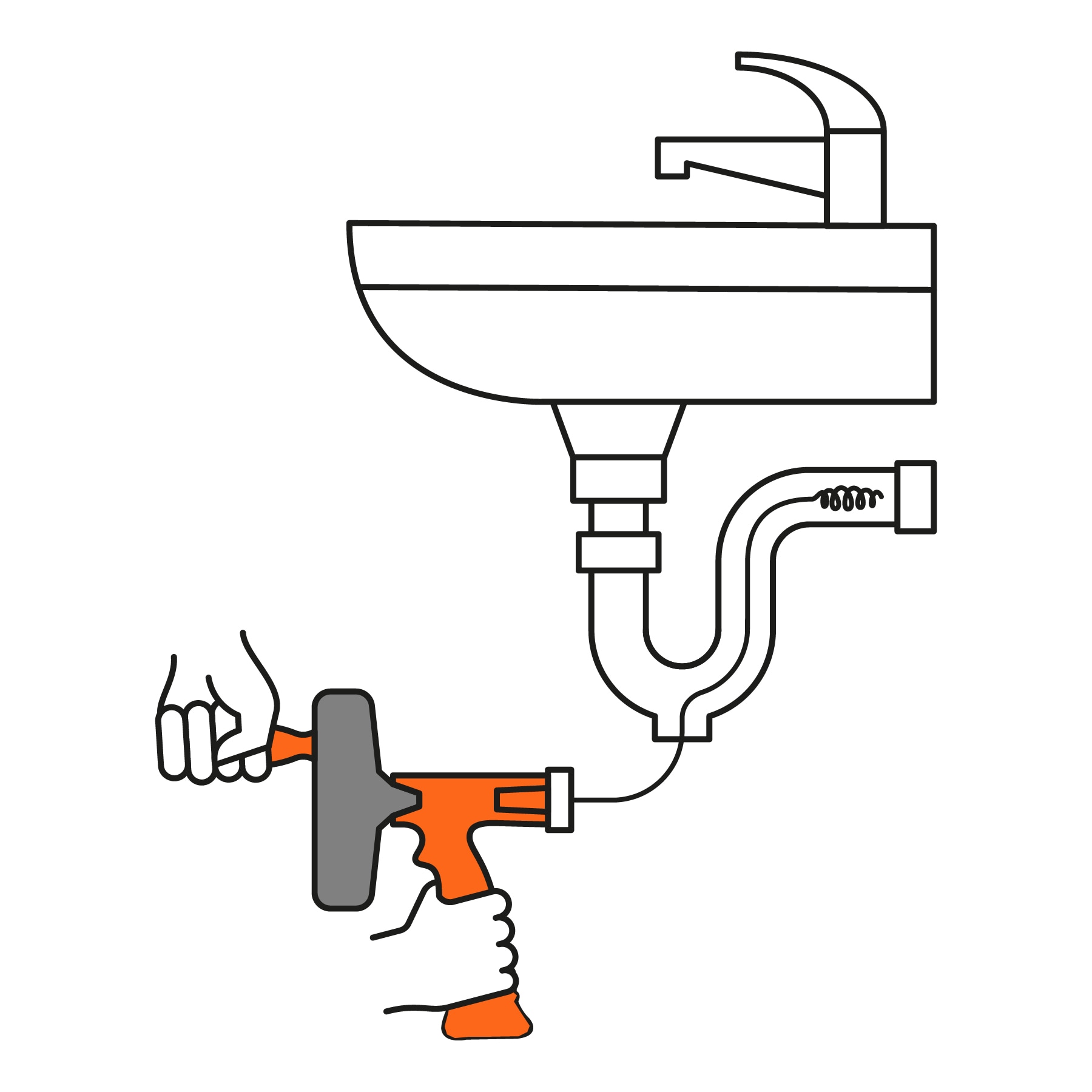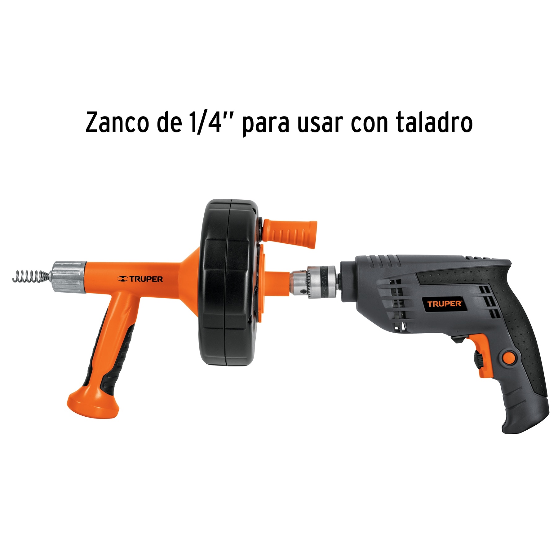 Guía de acero al carbono con embobinado compacto en tambor, que evita deformaciones por torsión y facilita el desplazamiento. Punta espiral. Mango ergonómico de polipropileno. Seguro de liberación rápida. Desazolva tuberías de lavabo, fregader, lavaplatos, tinas, regaderas y sanitarios.