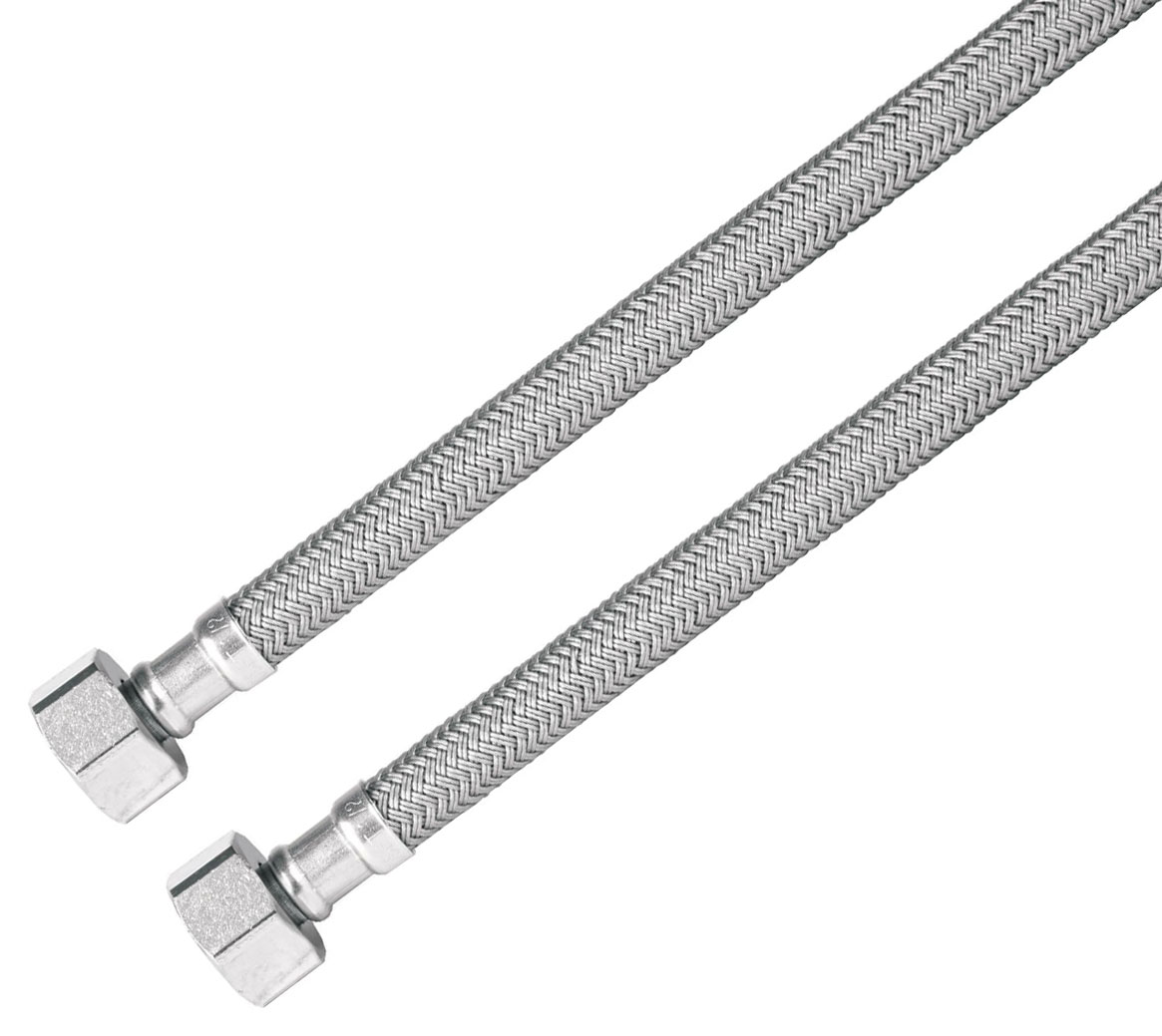 • DescripciónTuercas 1/2" de latón niquelado. Espigas de latón resistentes a la corrosión. Férulas de acero inoxidable. Trenzado con vinilo sobre manguera de hule EPDM para mayor flexibilidad y alta resistencia. Empaques de hule.