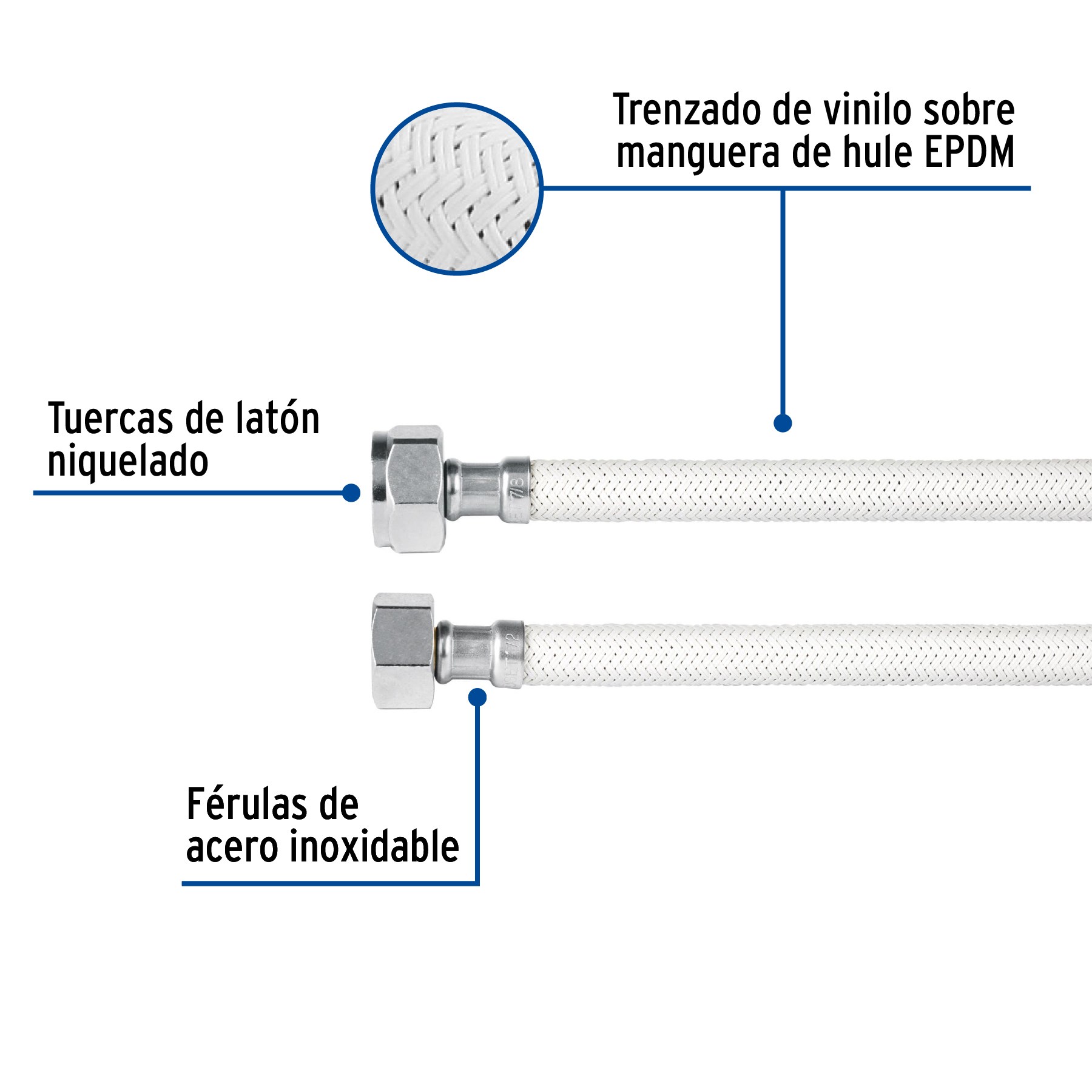 DescripciónTuercas 1/2" y 7/8" de latón niquelado. Espigas de latón resistentes a la corrosión. Férulas de acero inoxidable. Trenzado con vinilo sobre manguera de hule EPDM para mayor flexibilidad y alta resistencia. Empaques de hule.Comentarios0 Tuercas 1/2" y 7/8" de latón niquelado. Espigas de latón resistentes a la corrosión. Férulas de acero inoxidable. Trenzado con vinilo sobre manguera de hule EPDM para mayor flexibilidad y alta resistencia. Empaques de hule. Escribe una reseña No hay comentarios aún