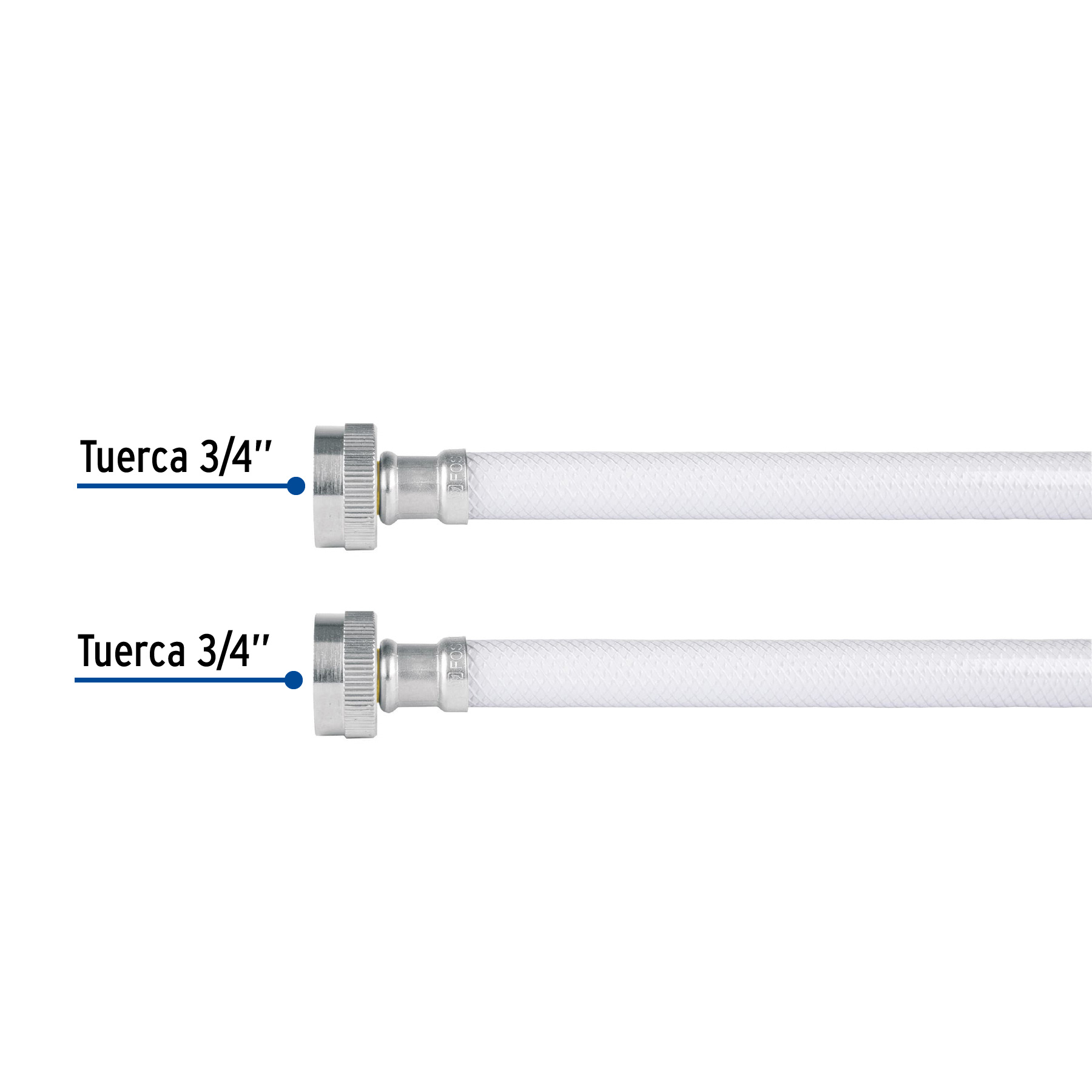 Tuercas 3/4" de latón niquelado. Espigas de latón resistente a la corrosión. Férulas de acero inoxidable. Trenzado de poliéster con cubierta de vinilo sobre manguera de PVC para mayor flexibilidad y alta resistencia. Empaques de hule.