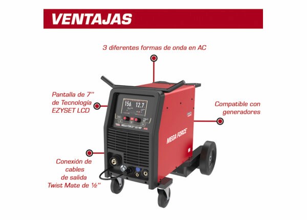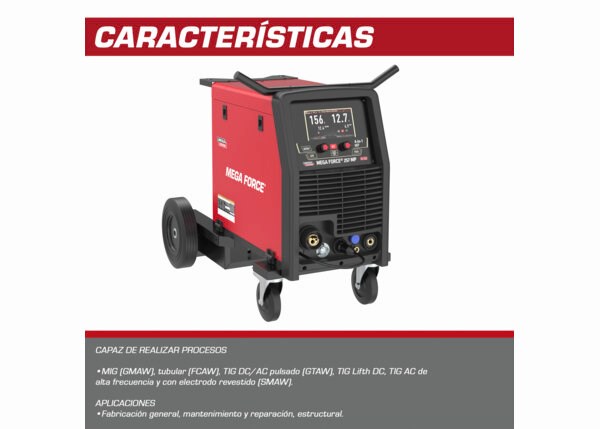Simple de operar, Modo Sinergico / Manual. Ajuste fácil debido a su Pantalla LCD. Indicador de Protección Térmica. Indicador VRD (dispositivo de reducción de voltaje) SMAW. Conexión rápida Twist Mate. Compatible con Generadores. Capacidad Carrete Sólido y Tubular 15 kg (0.035/0.045”).