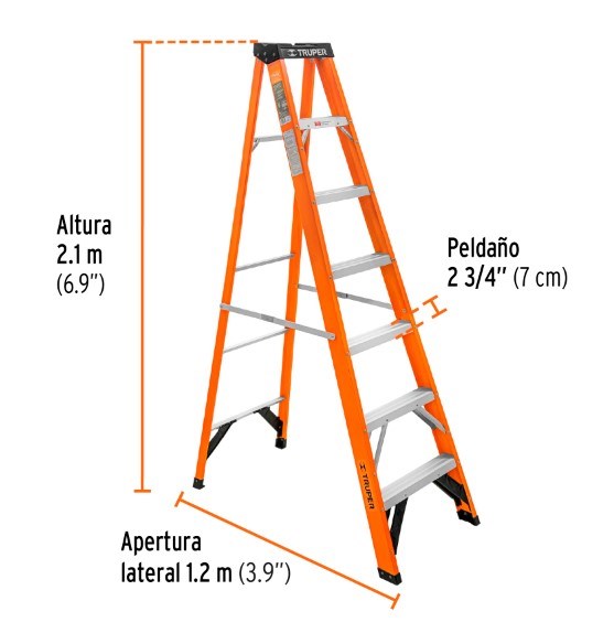 • DescripciónEstructura de aluminio. Peldaños antiderrapantes 2 3/4" (7 cm). Separadores externos para mayor estabilidad. Bandeja retráctil. Doble refuerzo en peldaños inferiores para mayor resistencia.