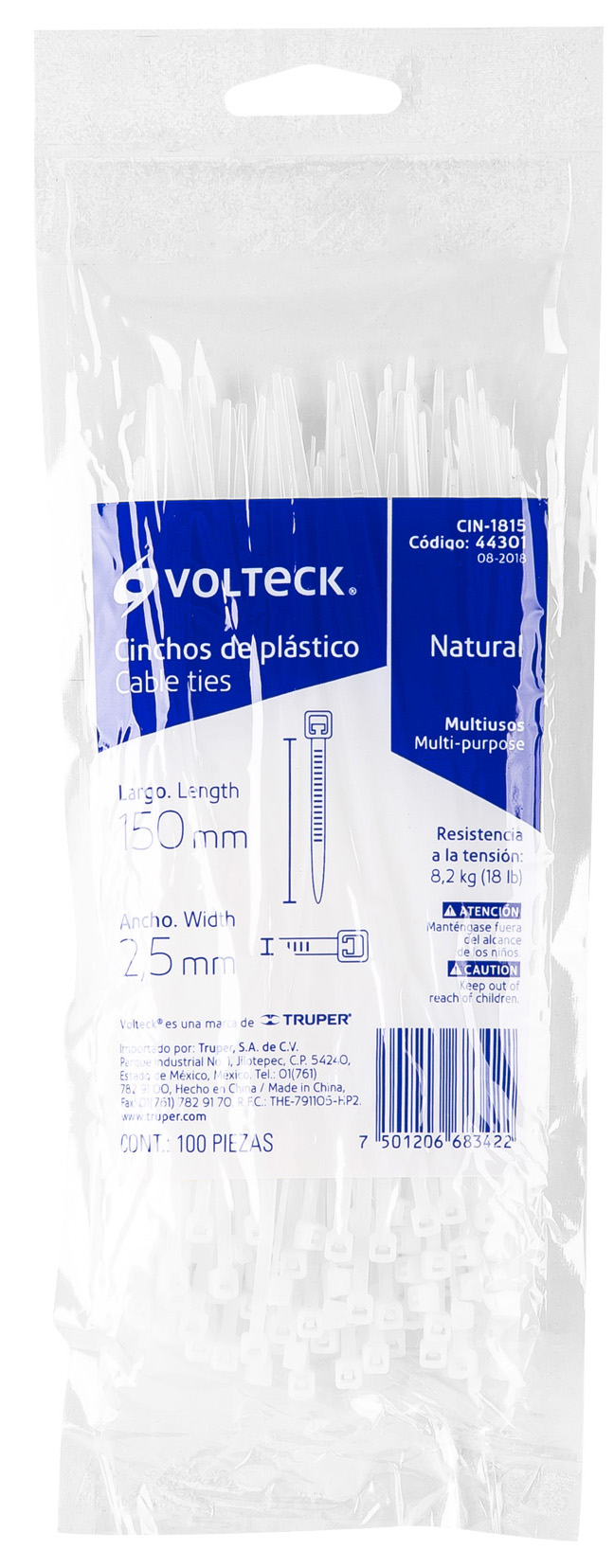 BOLSA CON 100 CINCHOS PLASTICOS DE 18 LBS DE 150 MM X 2.5 MM COLOR NATURAL VOLTECK
