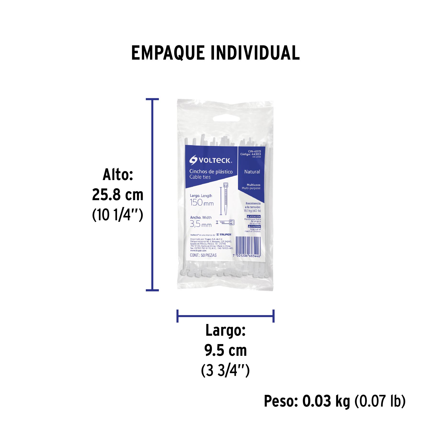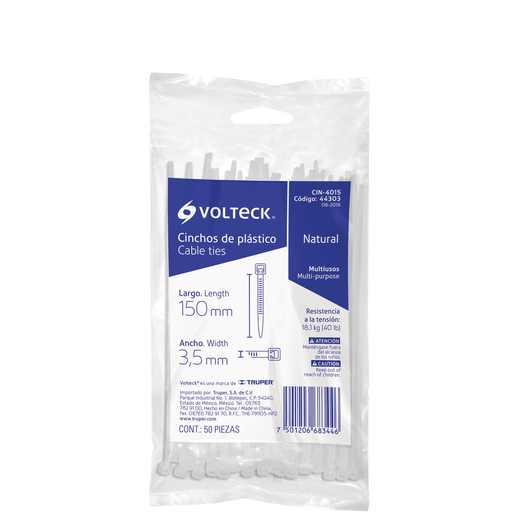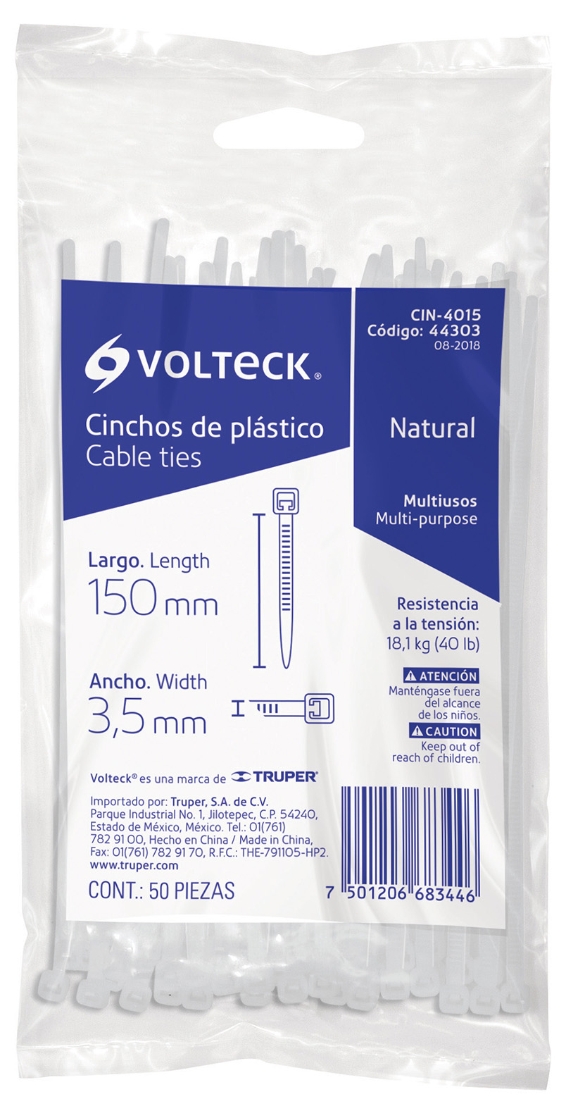 BOLSA CON 50 CINCHOS PLASTICOS DE 40 LBS DE 150 MM X 3.5 MM COLOR NATURAL VOLTECK