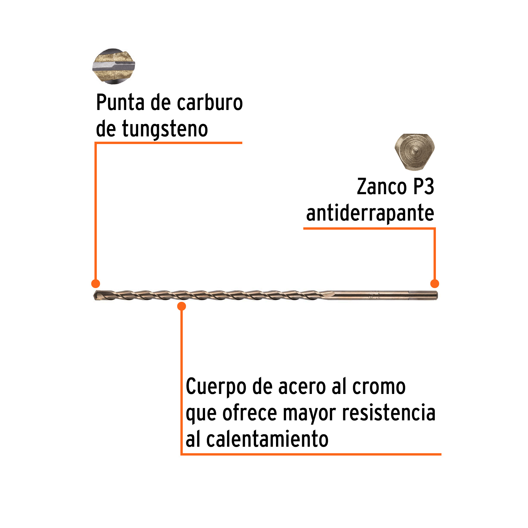 • DescripciónCuerpo de acero al cromo que ofrece mayor resistencia al calentamiento. Punta de carburo de tungsteno. Zanco P3 antiderrapante. Para rotomartillos (compatible con la mayoria de broqueros de mordaza).