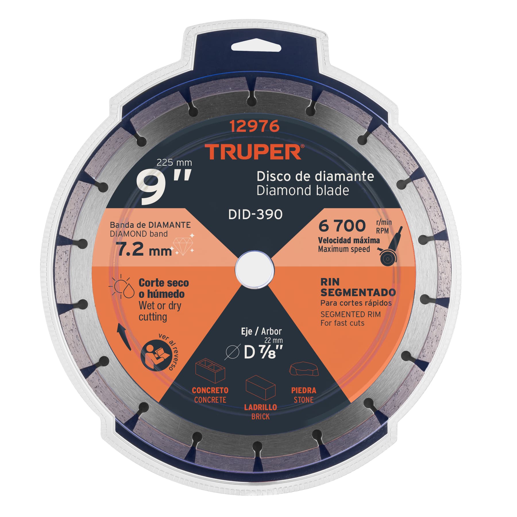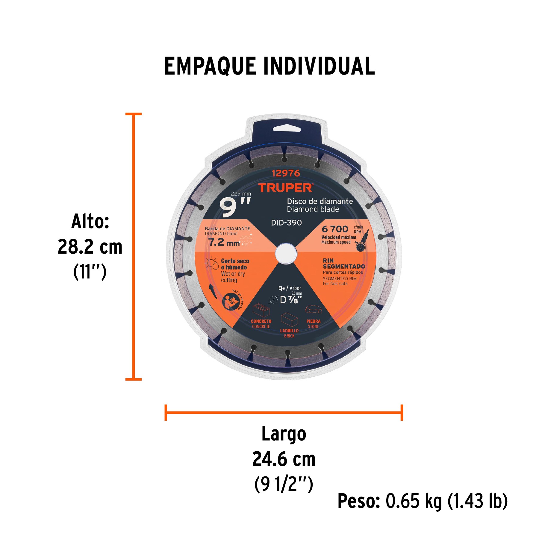 • DescripciónRin segmentado, máxima velocidad de corte y alto rendimiento. Corte en seco y húmedo. Para corte rápido en concreto, block, ladrillo y piedra. No se recomienda para loseta o mármol.