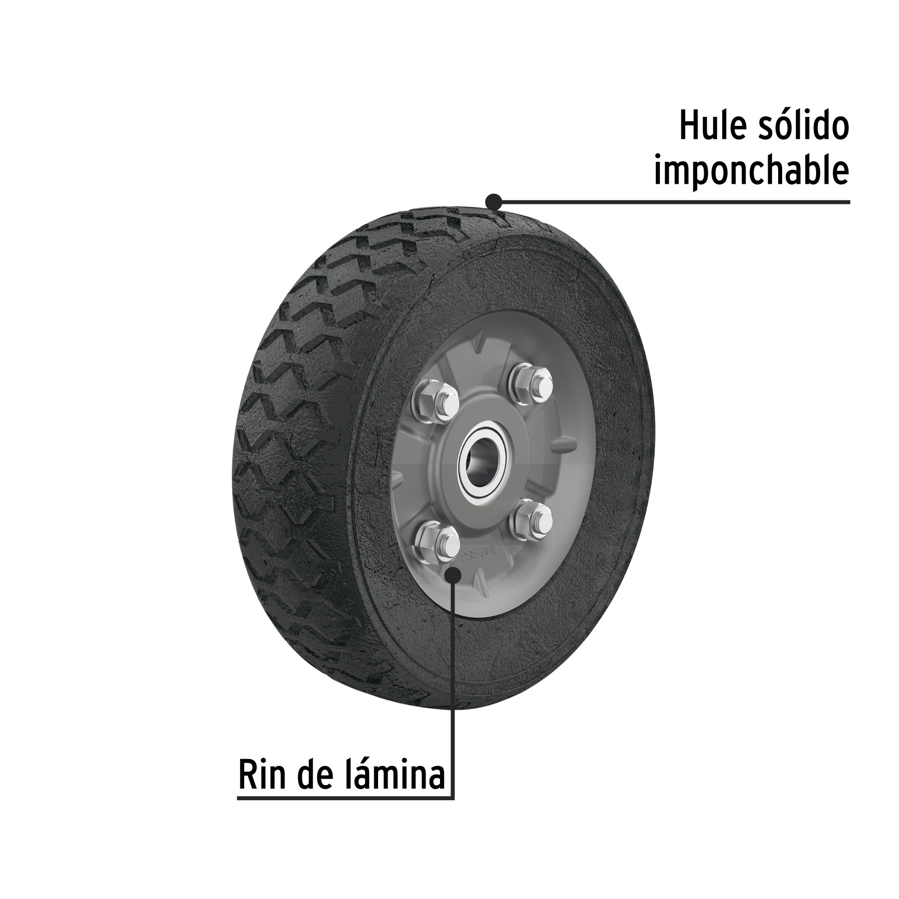 Rueda de hule sólido imponchable, en color negro.