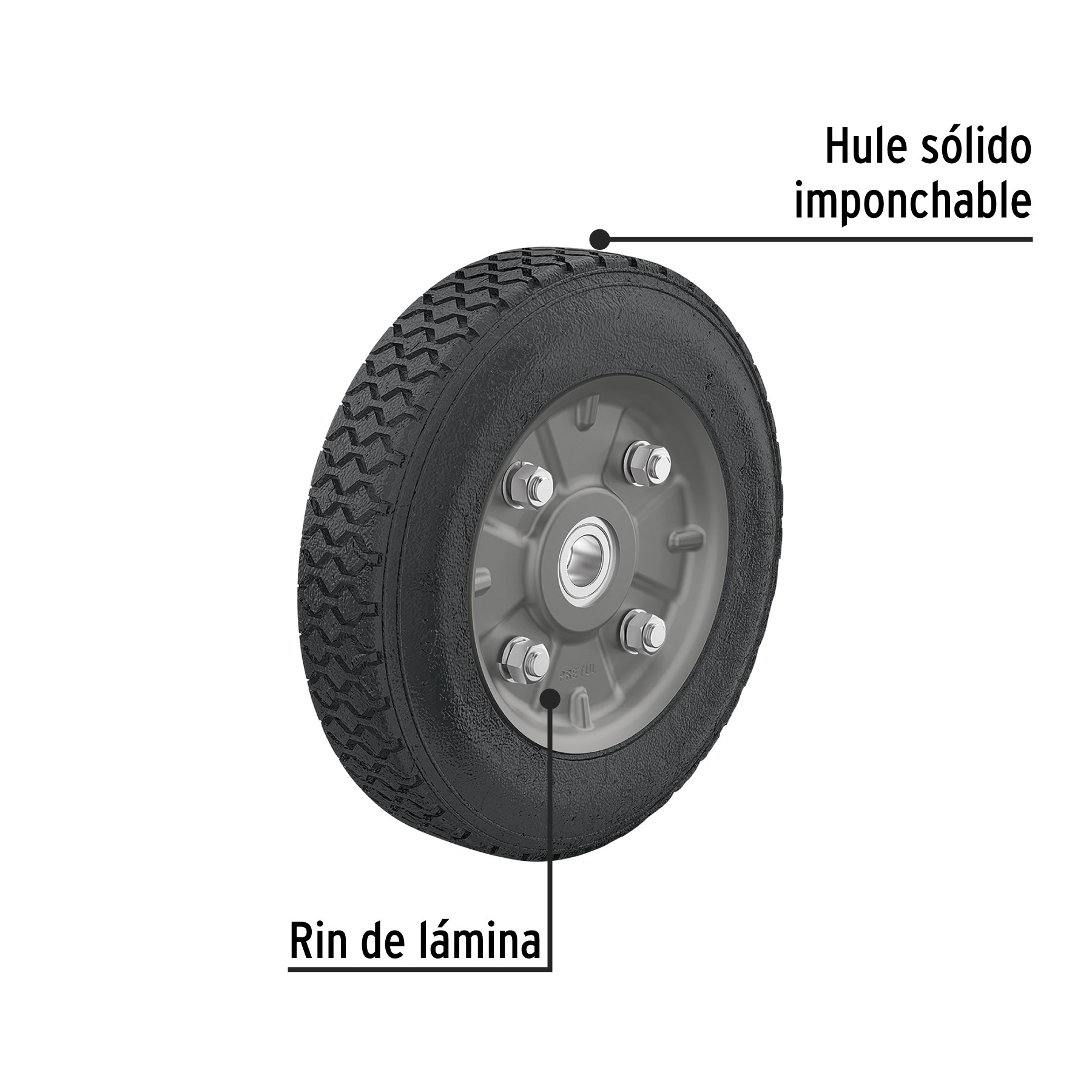 Rueda de hule sólido imponchable, en color negro.