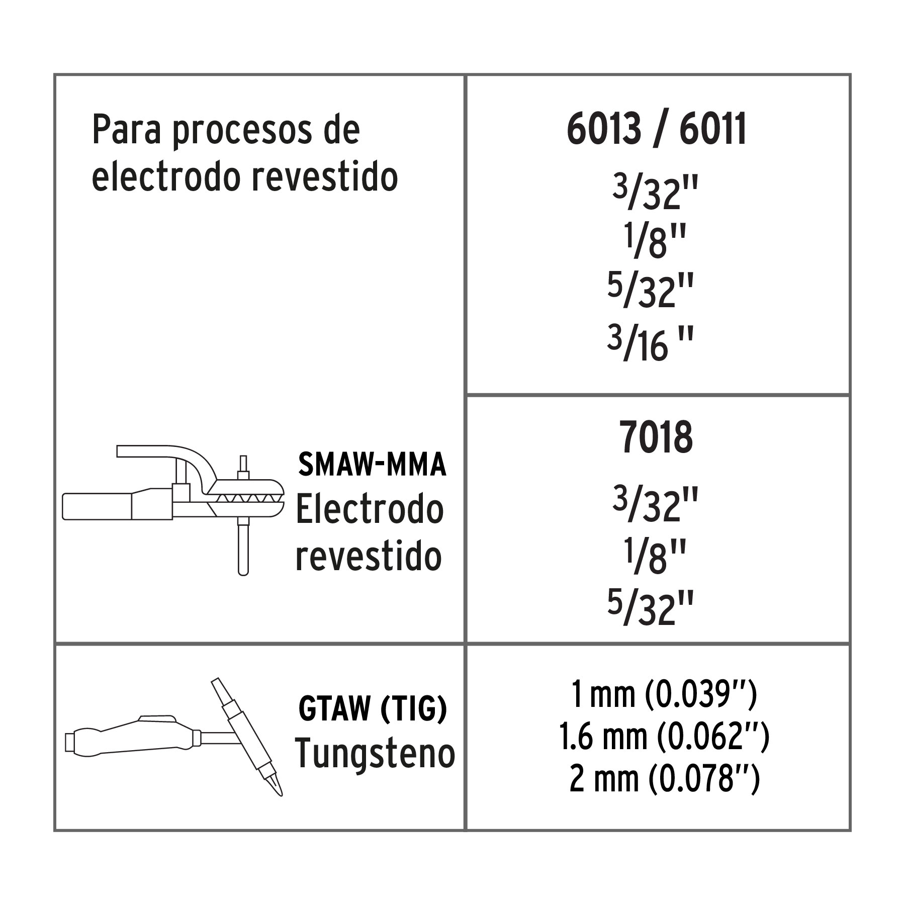 Para proceso de soldadura de electrodo revestido (SMAW - MMA) y soldadura de tungsteno (GTAW - TIG).